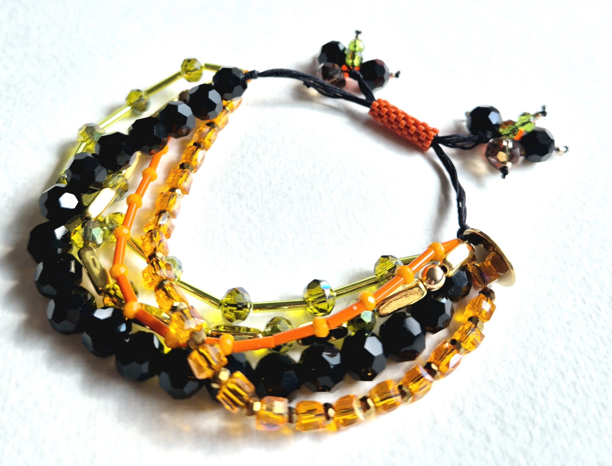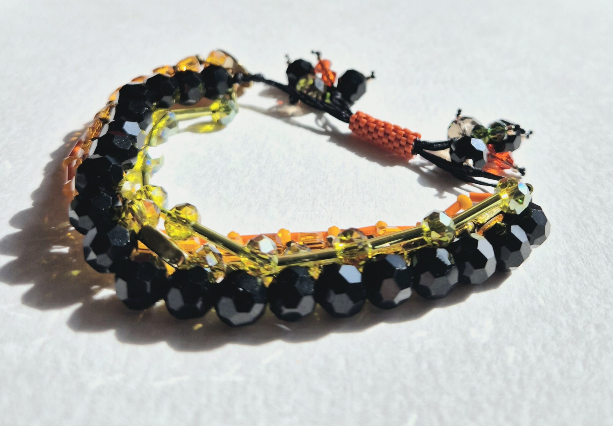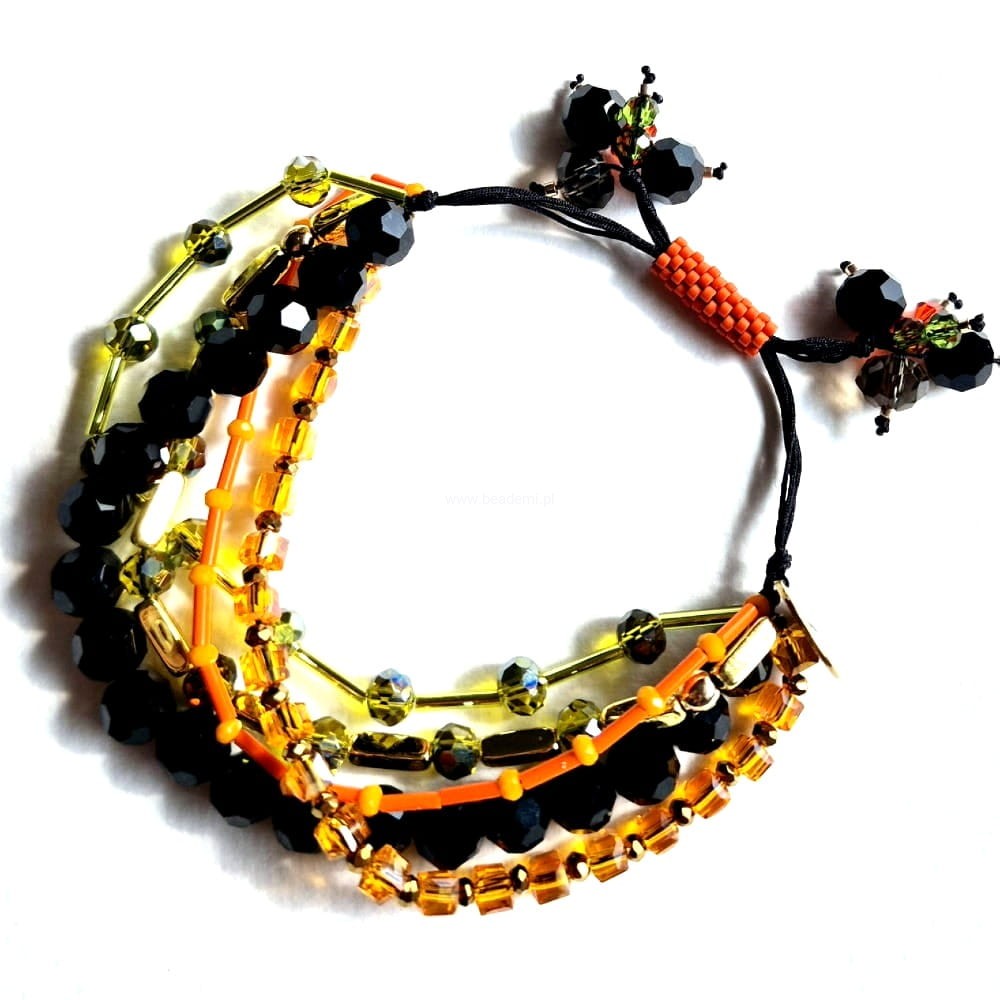 Oprócz szklanych kryształków, koralików i hematytu w 5 rzędach znajdziesz tutaj trwałą tulejkę wykonaną ze szklanych, japońskich koralików Toho. Tulejka trzyma ciasno nitki, więc bransoletka trzyma się mocno na nadgarstku. Jeśli chcesz ściągnąć nitki łap za największe kryształki po bokach tulejki.;-)