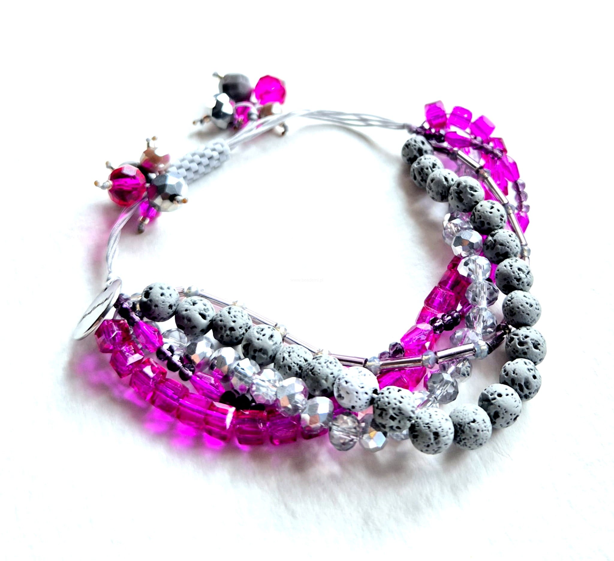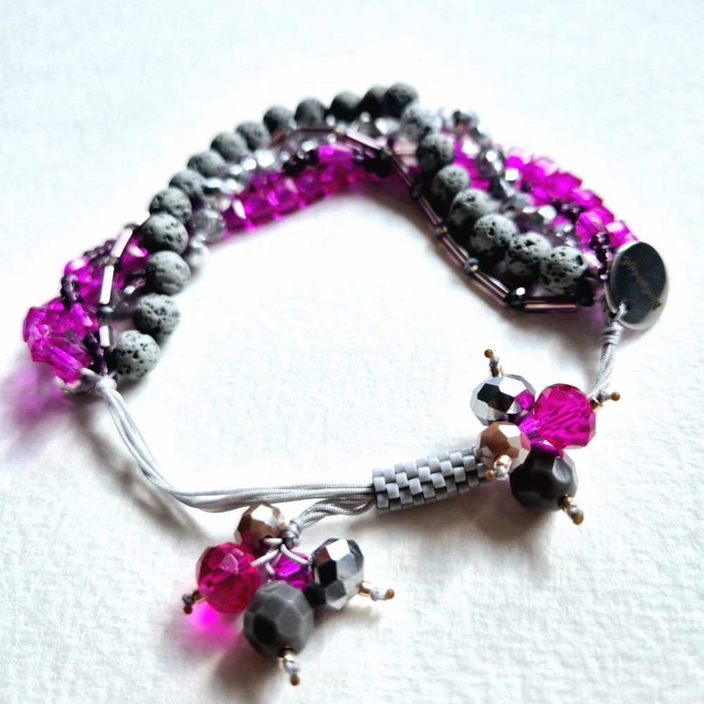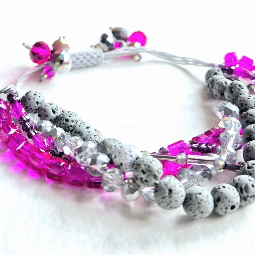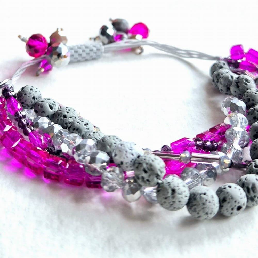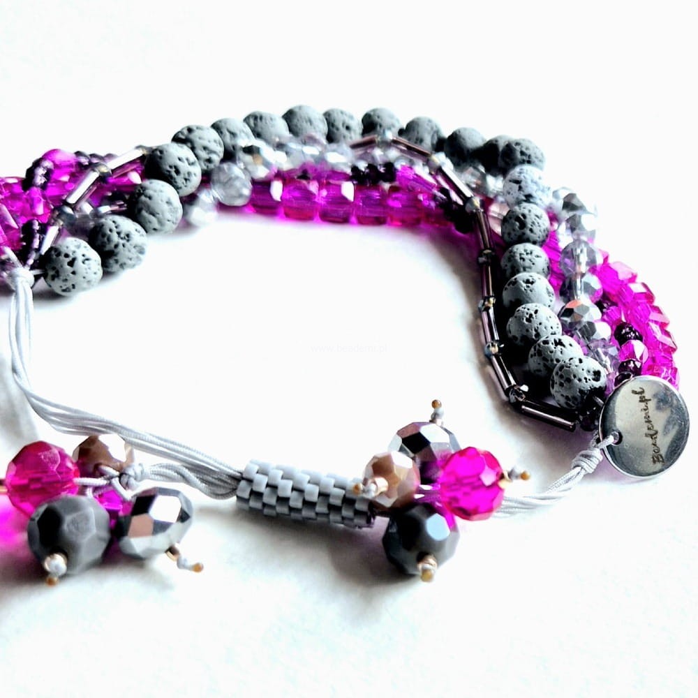 Oprócz szklanych kryształków, koralików i lawy w 5 rzędach znajdziesz tutaj trwałą tulejkę wykonaną ze szklanych, japońskich koralików Toho. Tulejka trzyma ciasno nitki, więc bransoletka trzyma się mocno na nadgarstku. Jeśli chcesz ściągnąć nitki łap za największe kryształki po bokach tulejki.;-)