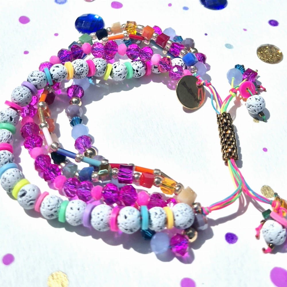 Oprócz szklanych kryształków, koralików i lawy w 5 rzędach znajdziesz tutaj trwałą tulejkę wykonaną ze szklanych, japońskich koralików Toho. Tulejka trzyma ciasno nitki, więc bransoletka trzyma się mocno na nadgarstku. Jeśli chcesz ściągnąć nitki łap za największe kryształki po bokach tulejki.;-)