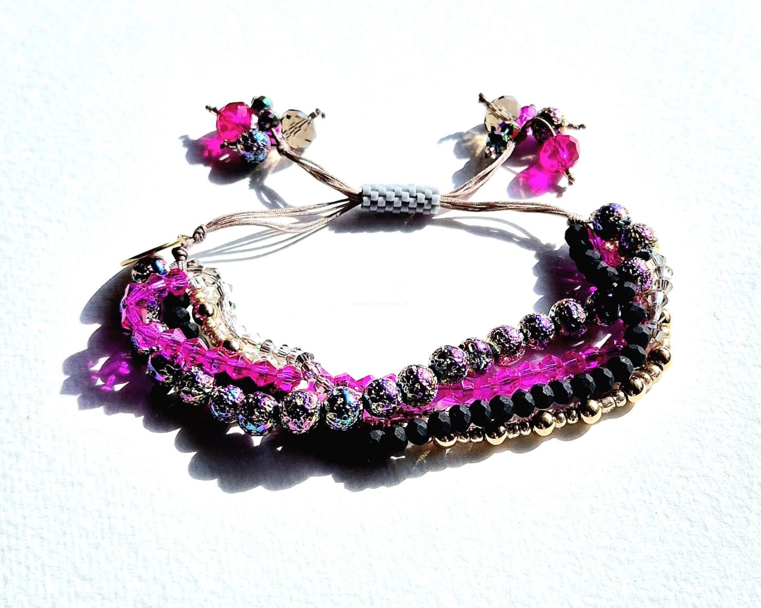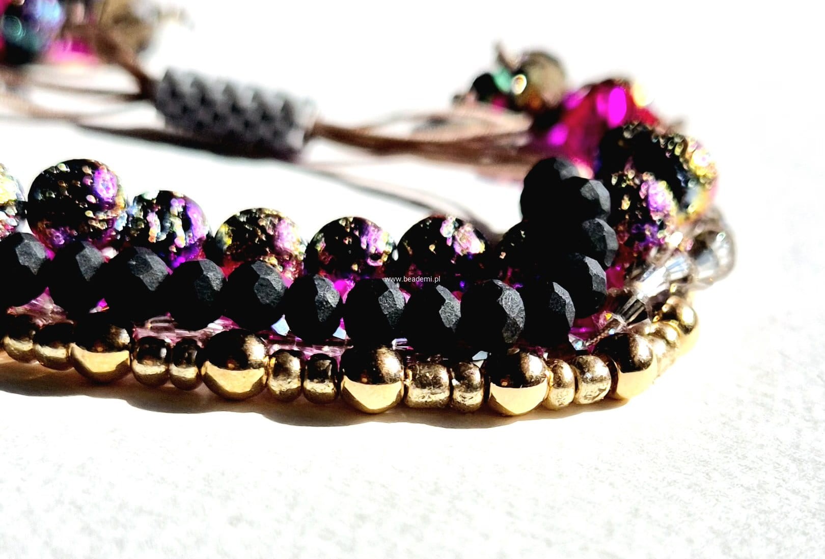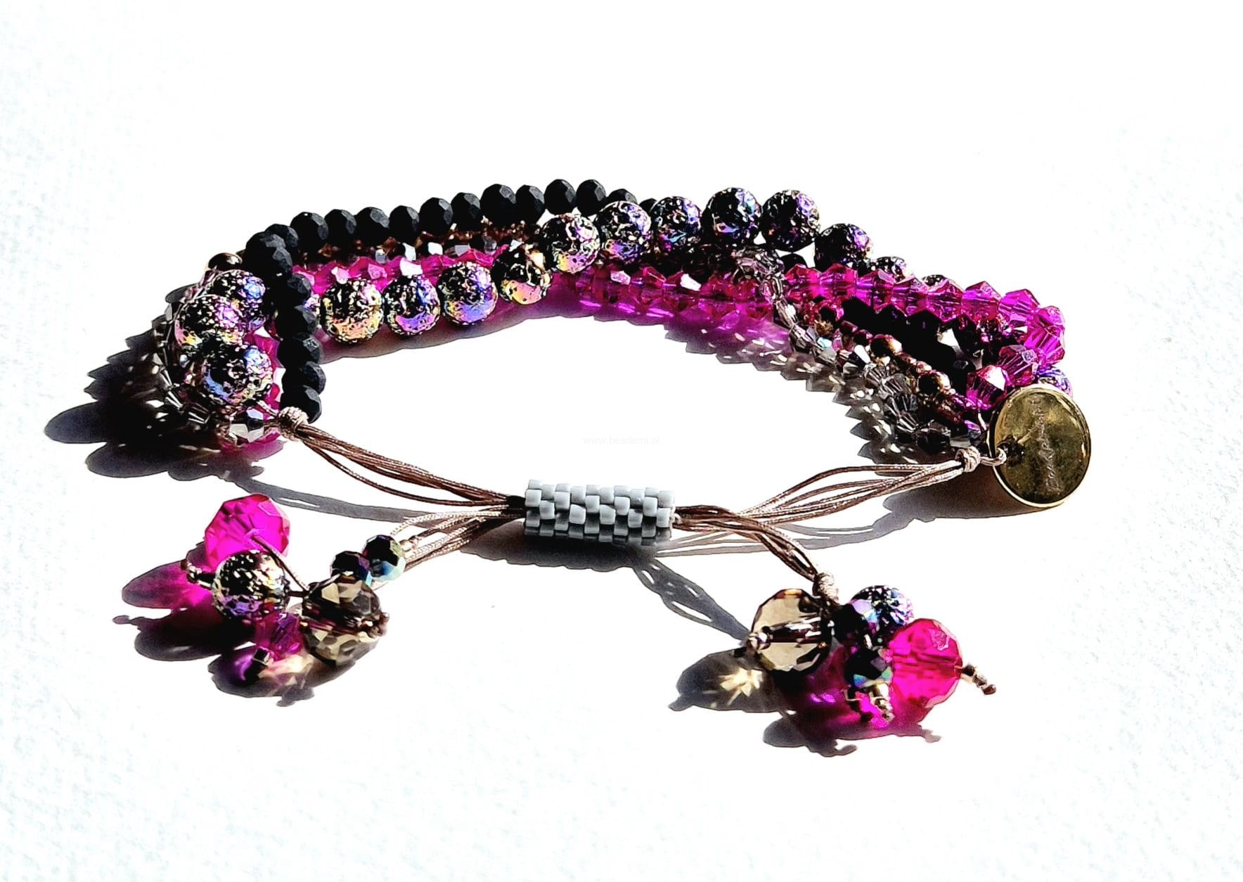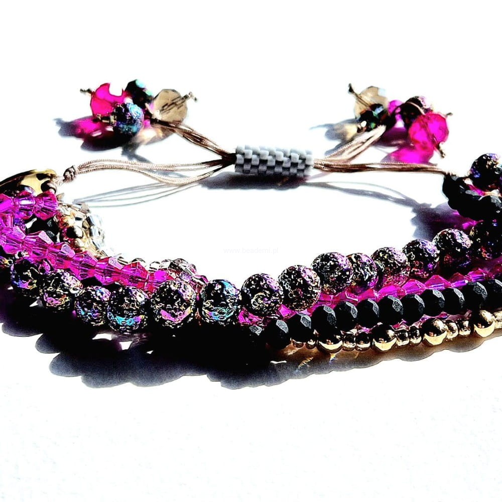 Oprócz szklanych kryształków, koralików i lawy w 5 rzędach znajdziesz tutaj trwałą tulejkę wykonaną ze szklanych, japońskich koralików Toho. Tulejka trzyma ciasno nitki, więc bransoletka trzyma się mocno na nadgarstku. Jeśli chcesz ściągnąć nitki łap za największe kryształki po bokach tulejki.;-)