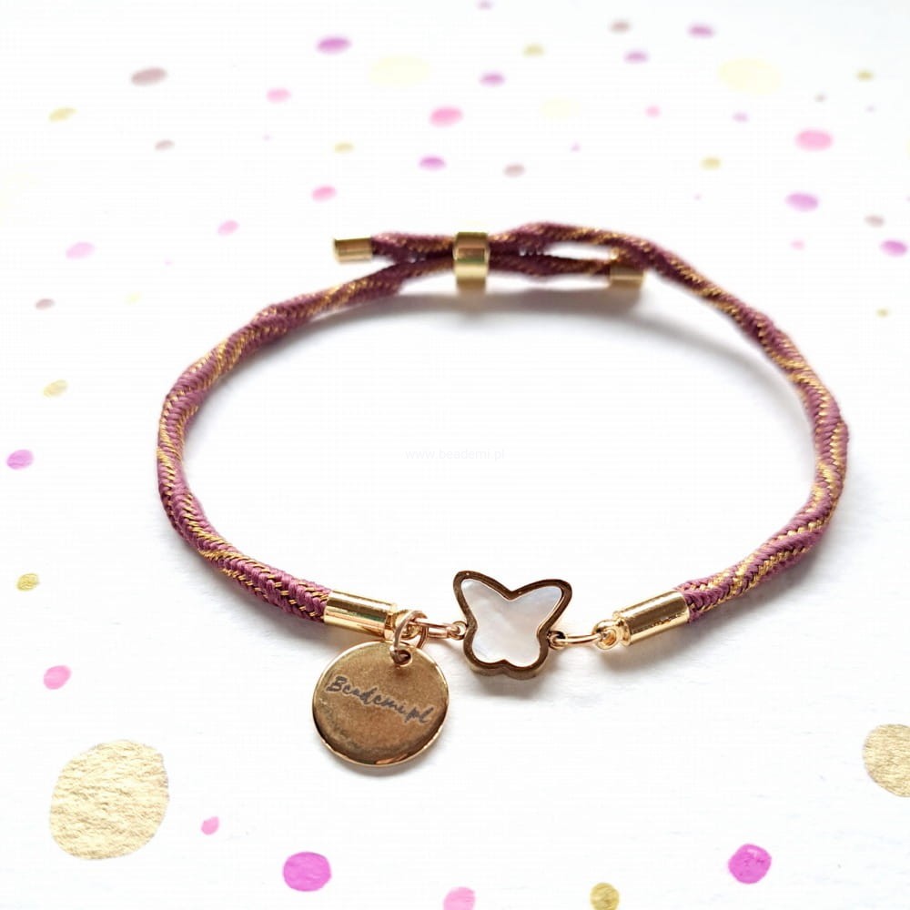 Sznurek jest tutaj przeplatany złotą nitką, a główną jej ozdobą jest motyl ze stali wypełnionej perłową, opalizującą masą.