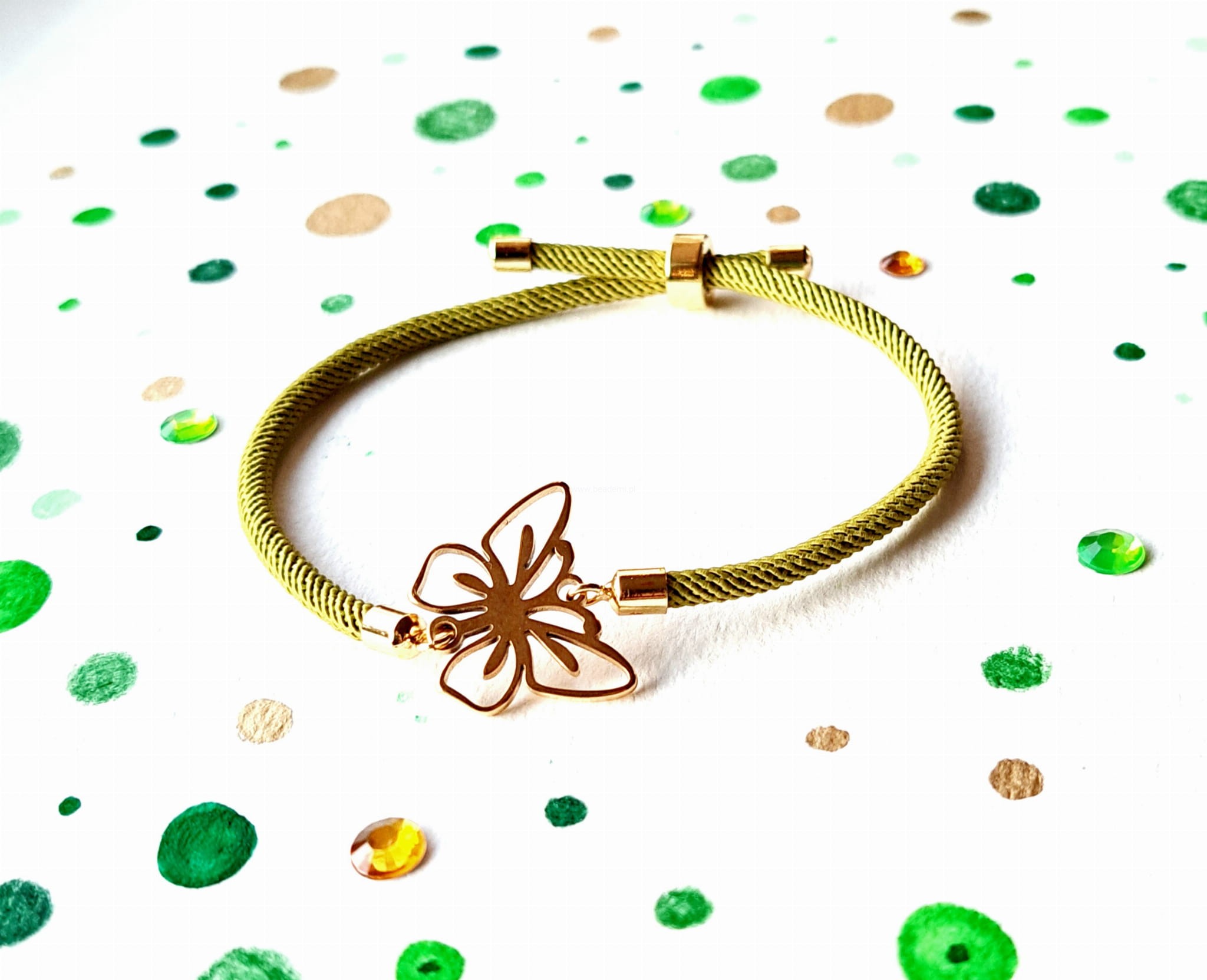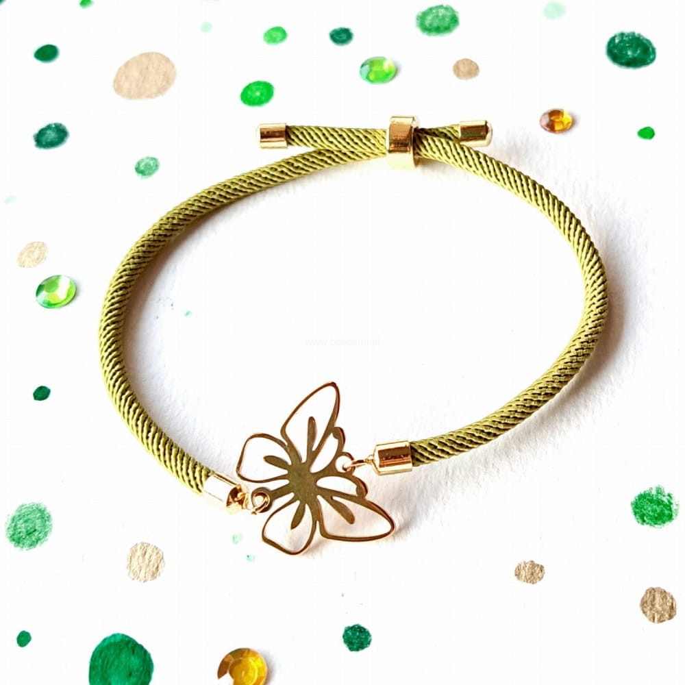 Sznurek jest tutaj zielony, a główną jej ozdobą jest stalowy motyl.