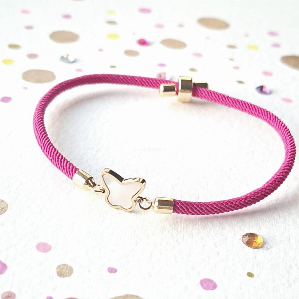 Sznurek jest tutaj w kolorze fuksji, a główną jej ozdobą jest motyl ze stali wypełnionej perłową, opalizującą masą.