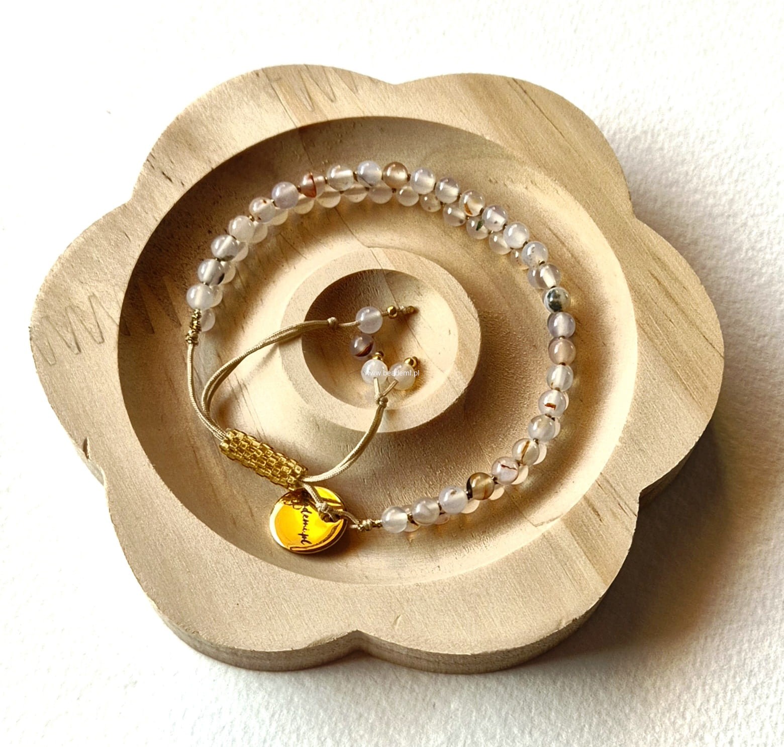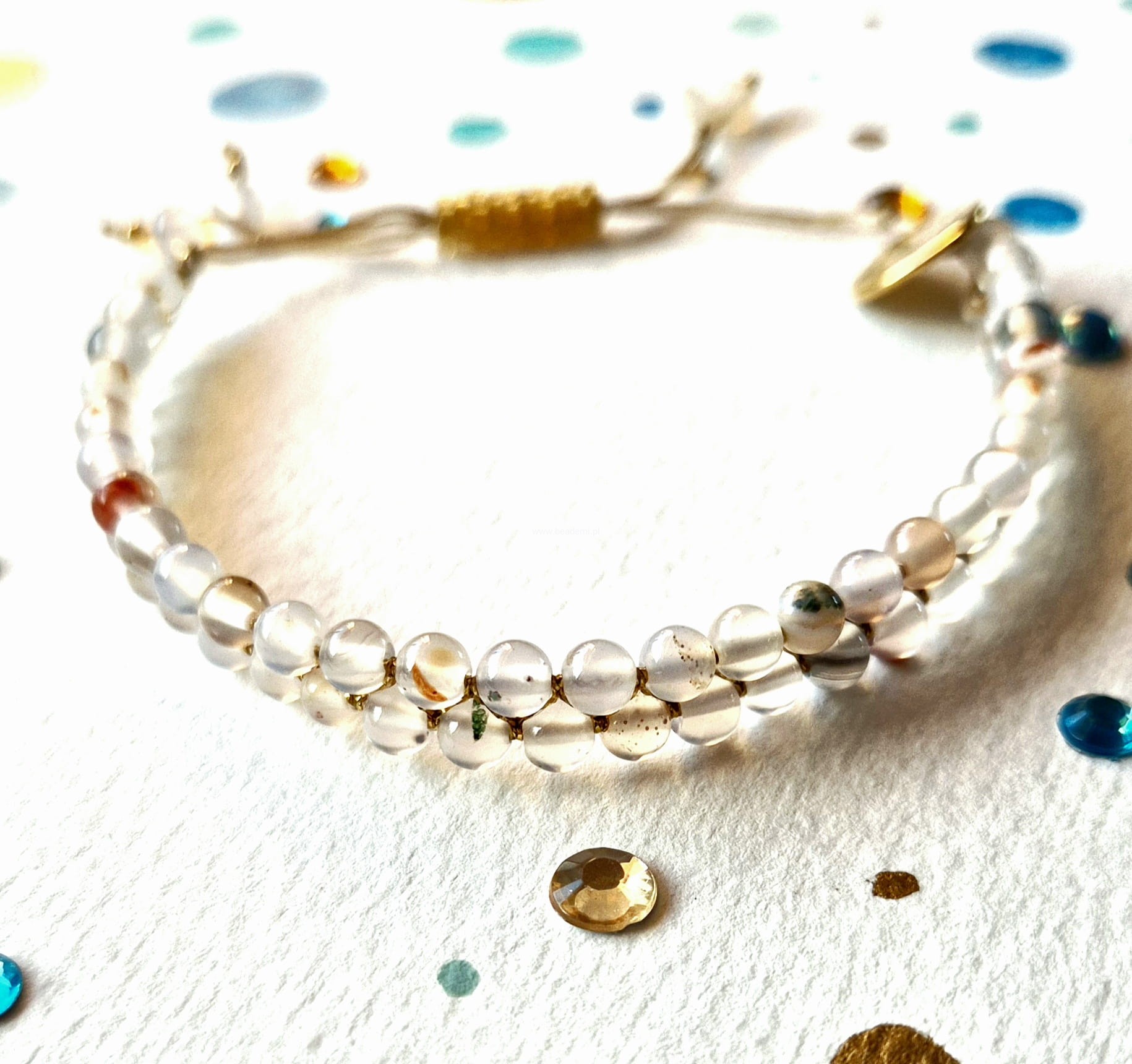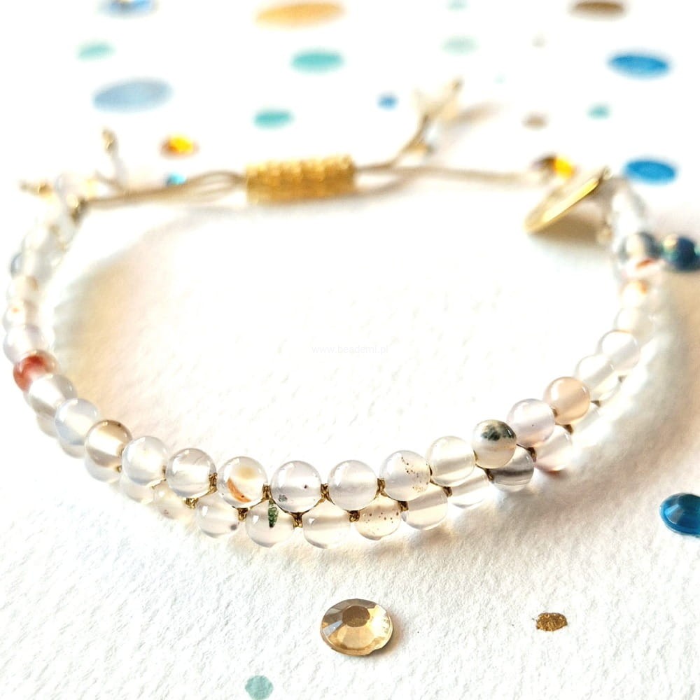 Oprócz agatowych kulek oplecionych mieniącą się beżową niteczką znajdziesz tutaj trwałą tulejkę wykonaną ze szklanych, japońskich koralików Toho. Tulejka trzyma ciasno nitki, więc bransoletka trzyma się mocno na nadgarstku. Kulki agatu przeplatane są nitką w kolorach beżu i złota.
