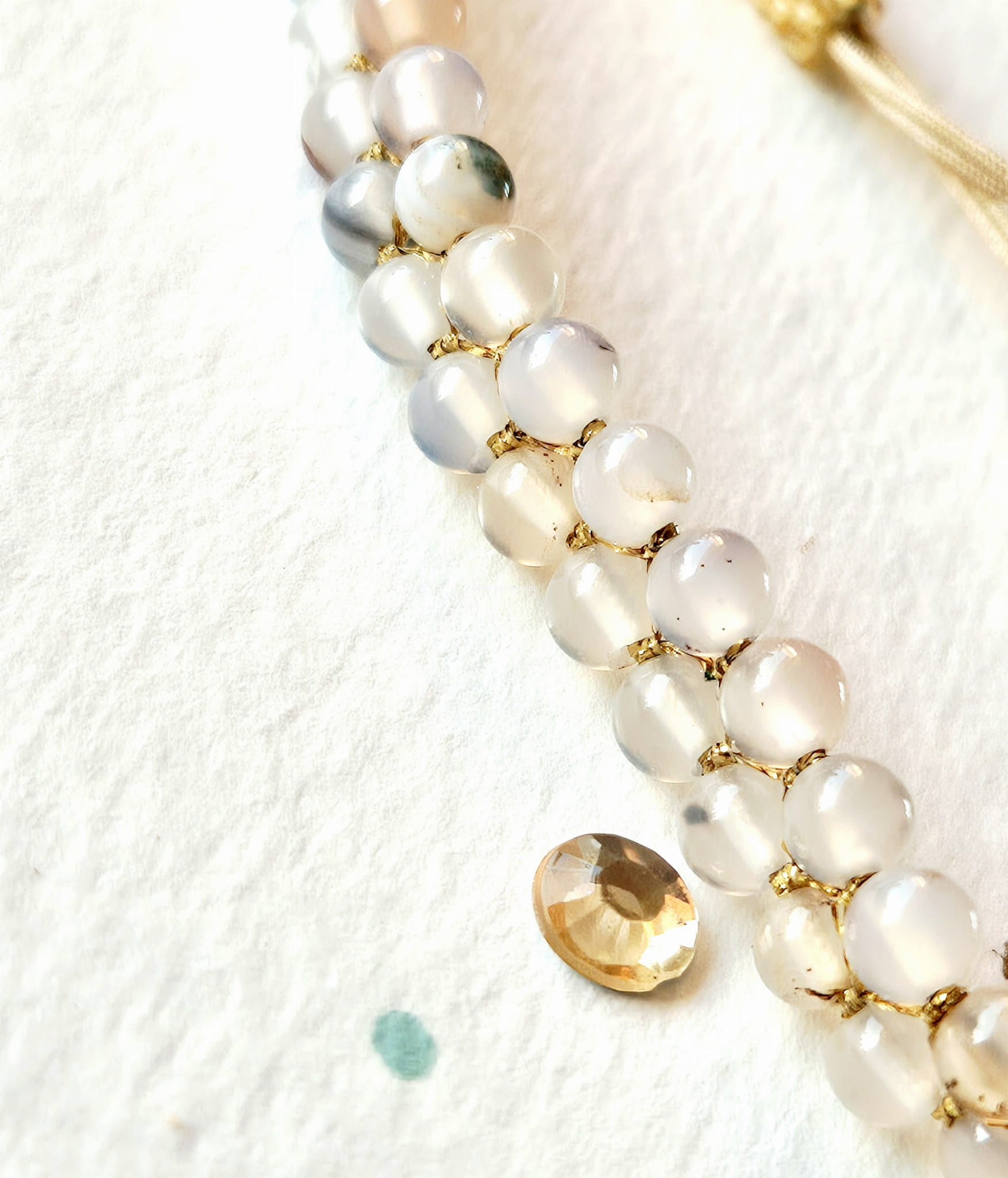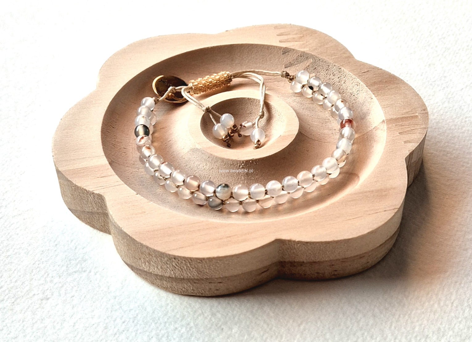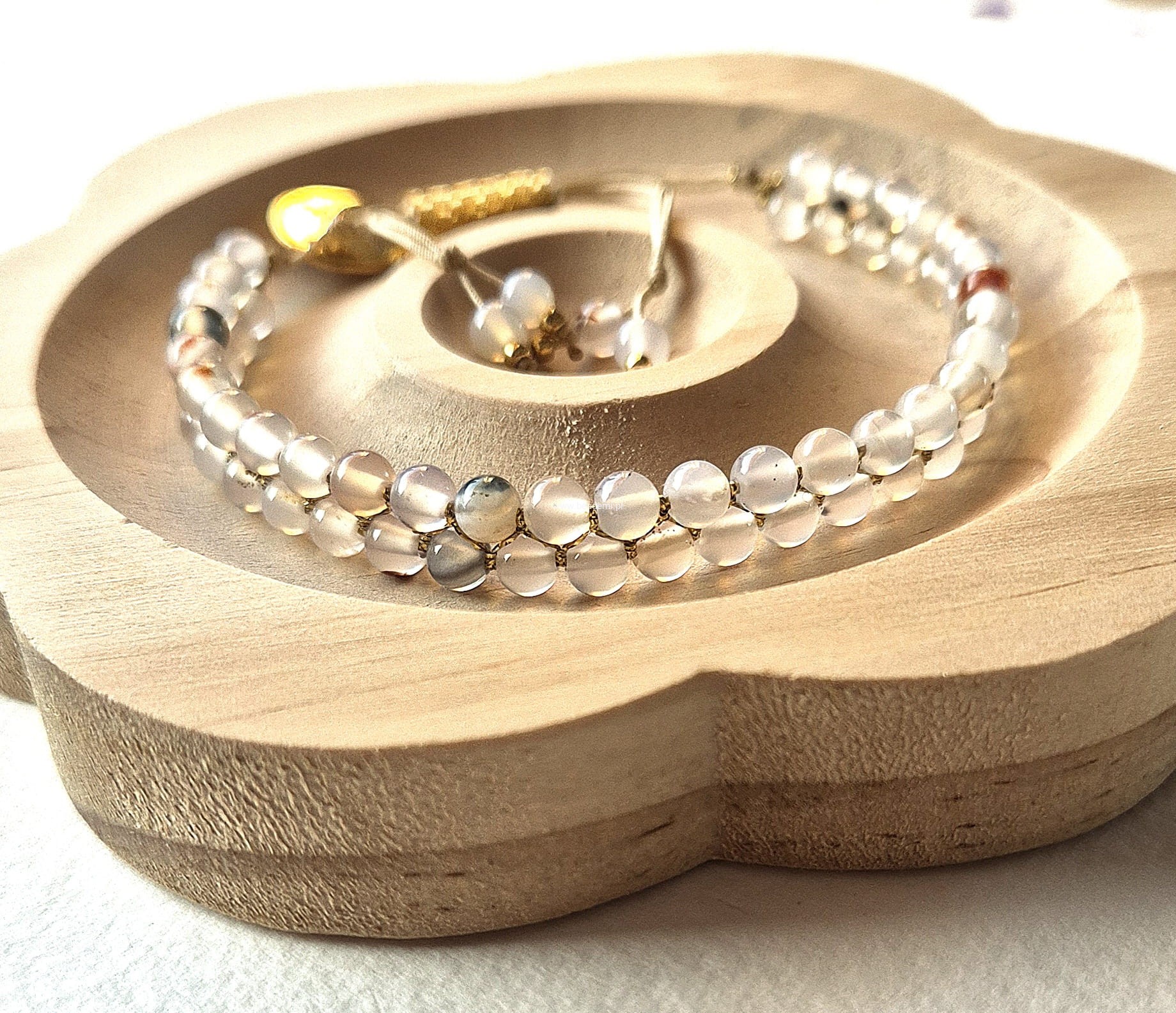Oprócz agatowych kulek oplecionych mieniącą się beżową niteczką znajdziesz tutaj trwałą tulejkę wykonaną ze szklanych, japońskich koralików Toho. Tulejka trzyma ciasno nitki, więc bransoletka trzyma się mocno na nadgarstku. Kulki agatu przeplatane są nitką w kolorach beżu i złota.