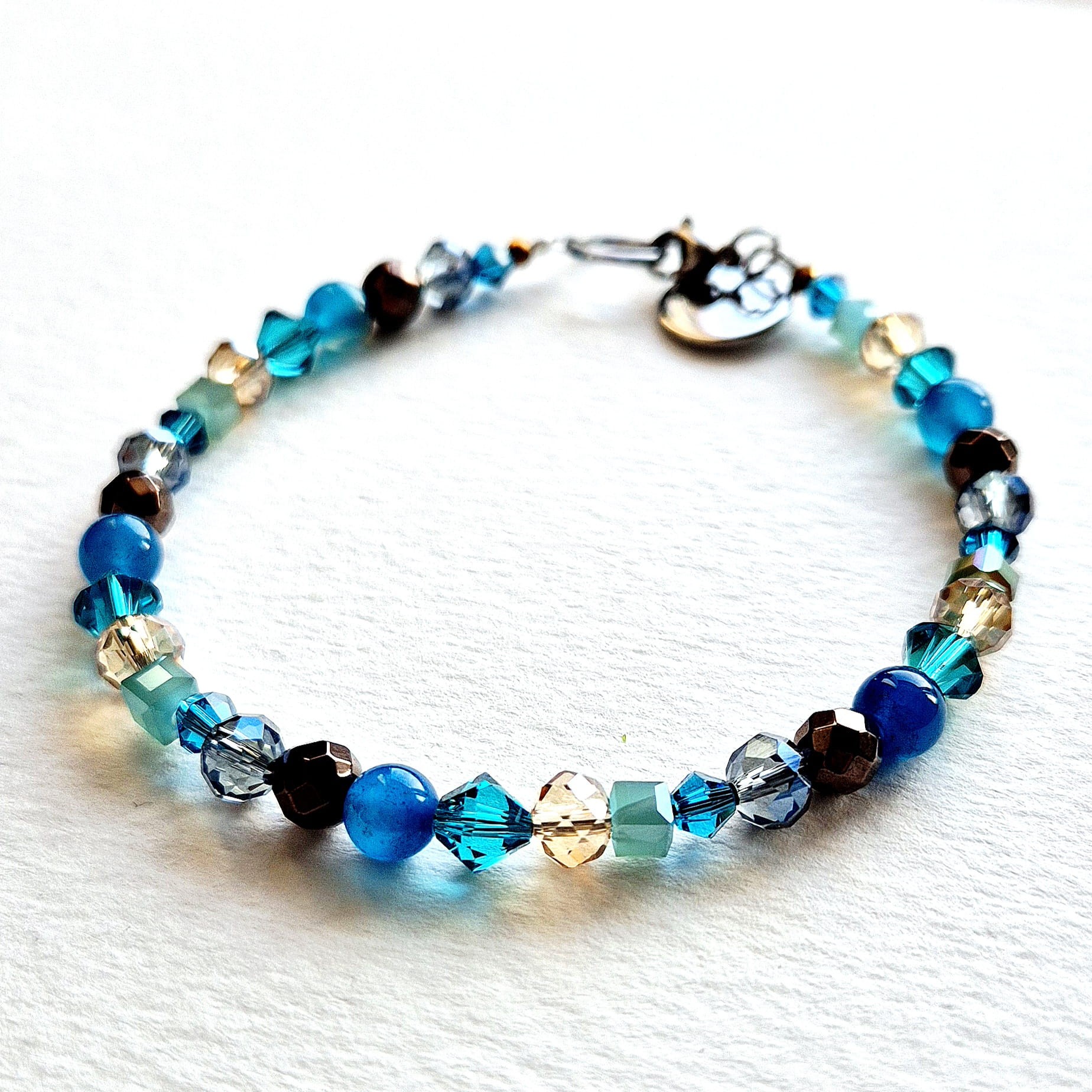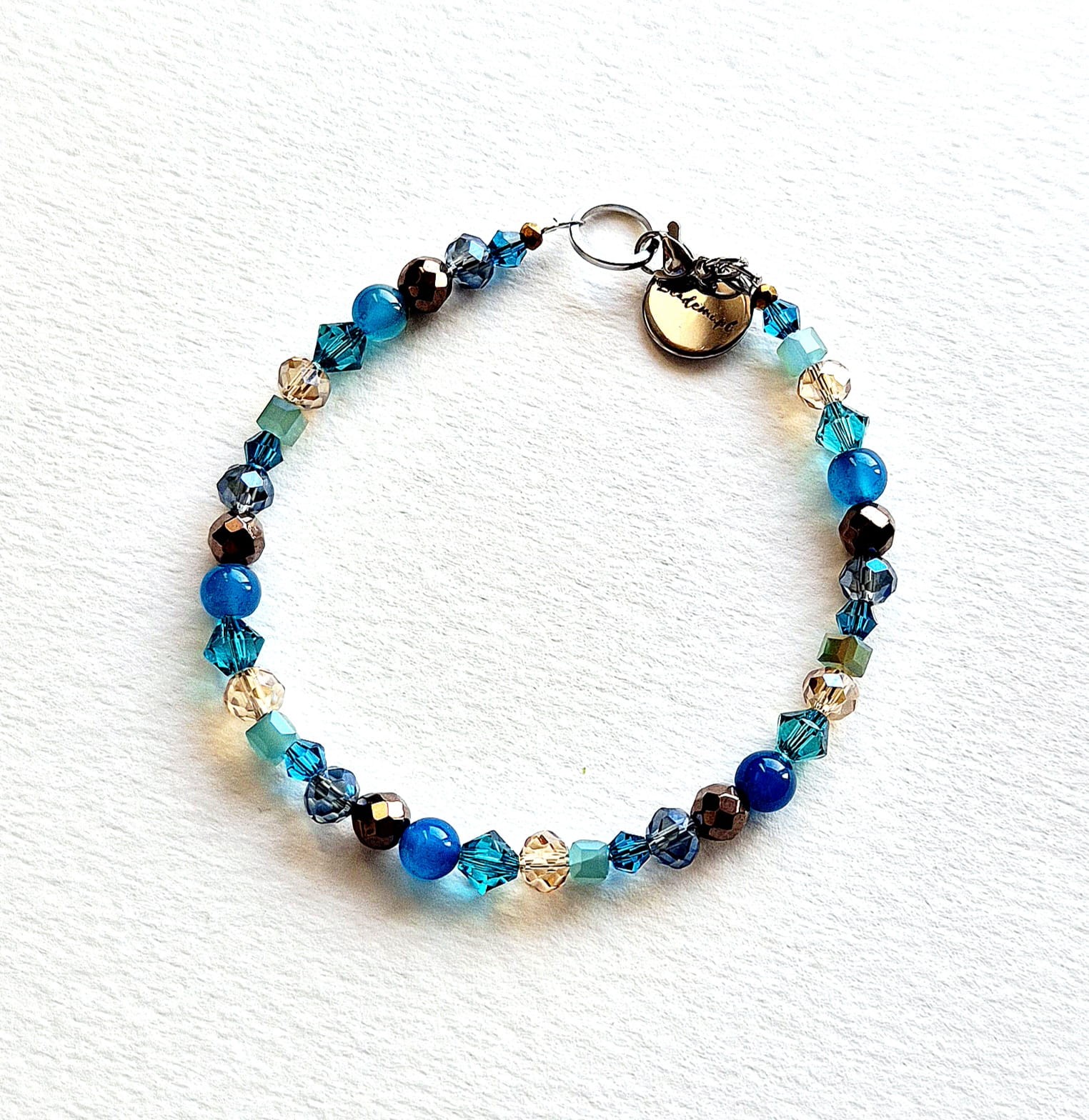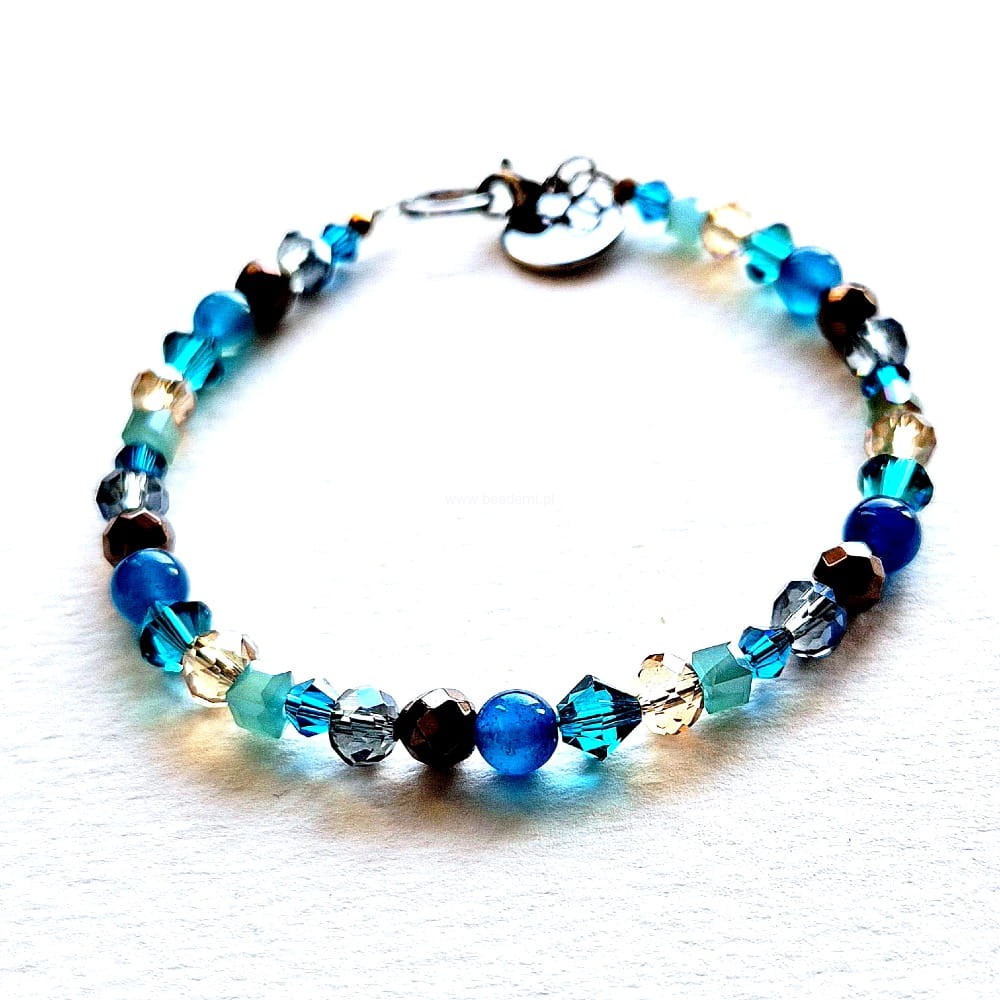 Całości dopełniają i kolorytu dodają szklane kryształki, te w kształcie rombów to kryształki Swarovskiego. Bransoletka ma również znaczek Beademi.pl wykonany ze stali.