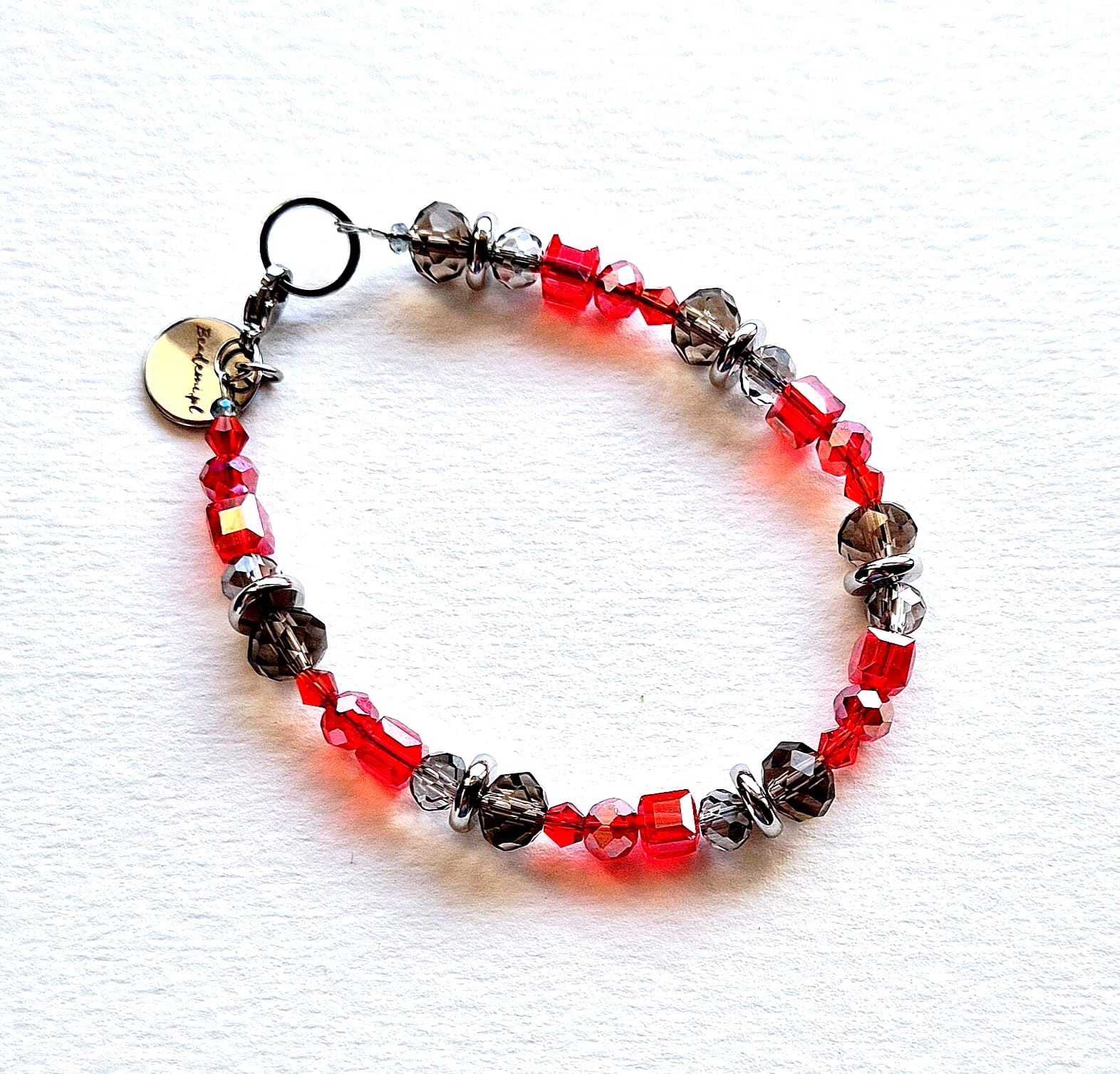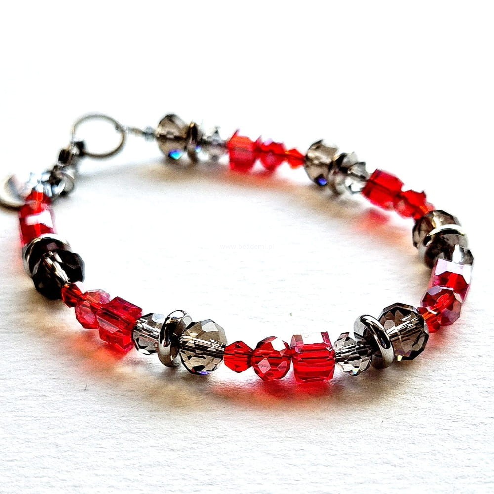Całości dopełniają i kolorytu dodają szklane kryształki, te w kształcie rombów to kryształki Swarovskiego. Bransoletka ma również znaczek Beademi.pl wykonany ze stali.