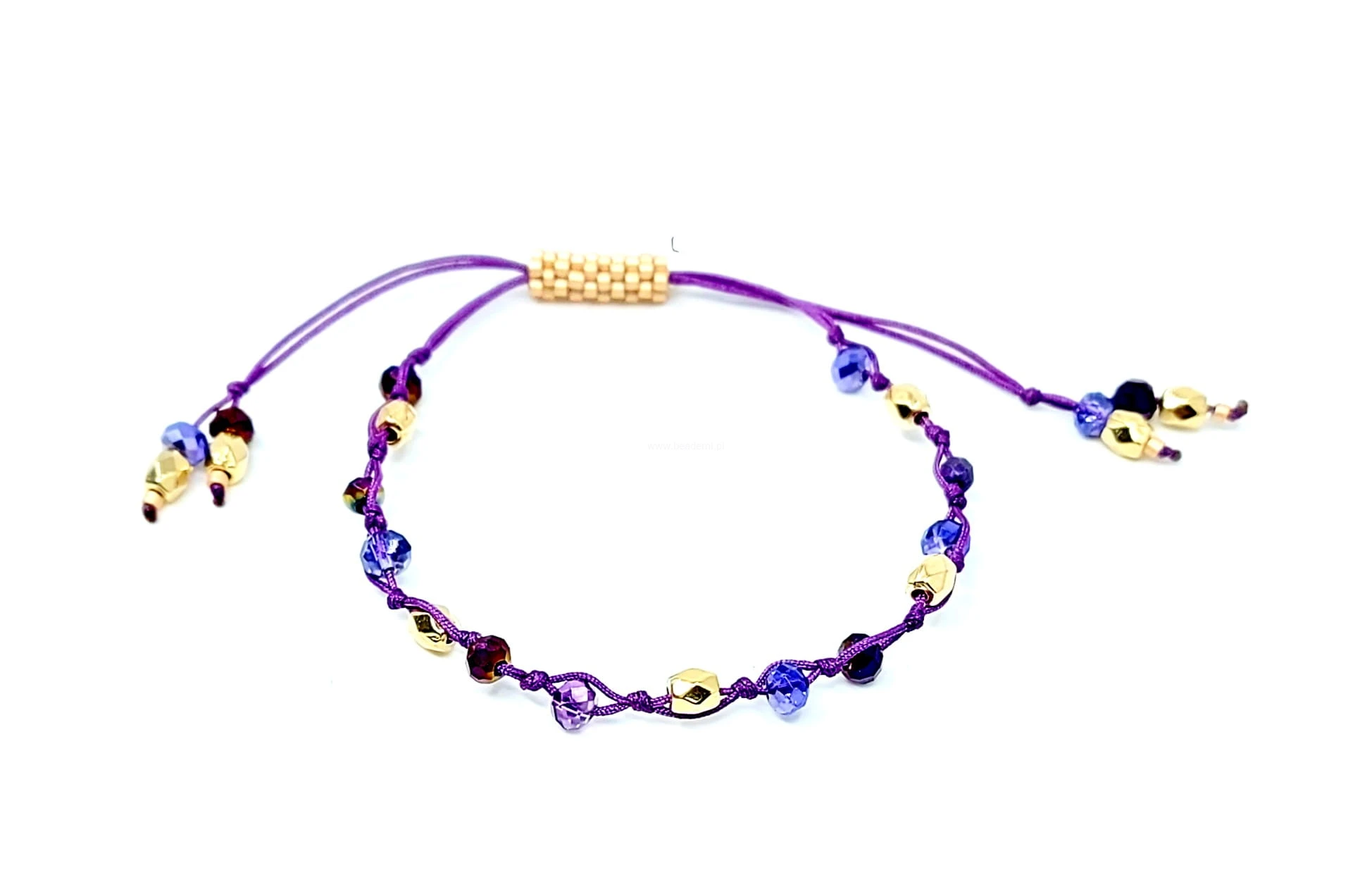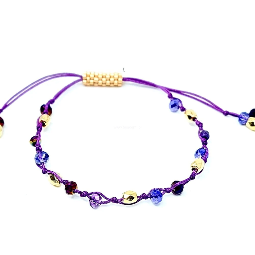 Oprócz szklanych kryształków w kolorze fioletu i złota znajdziesz tutaj trwałą tulejkę wykonaną ze szklanych, japońskich koralików Toho. Tulejka trzyma ciasno nitki, więc bransoletka trzyma się mocno na nadgarstku. Jeśli chcesz ściągnąć nitki łap za największe kryształki po bokach tulejki.;-)