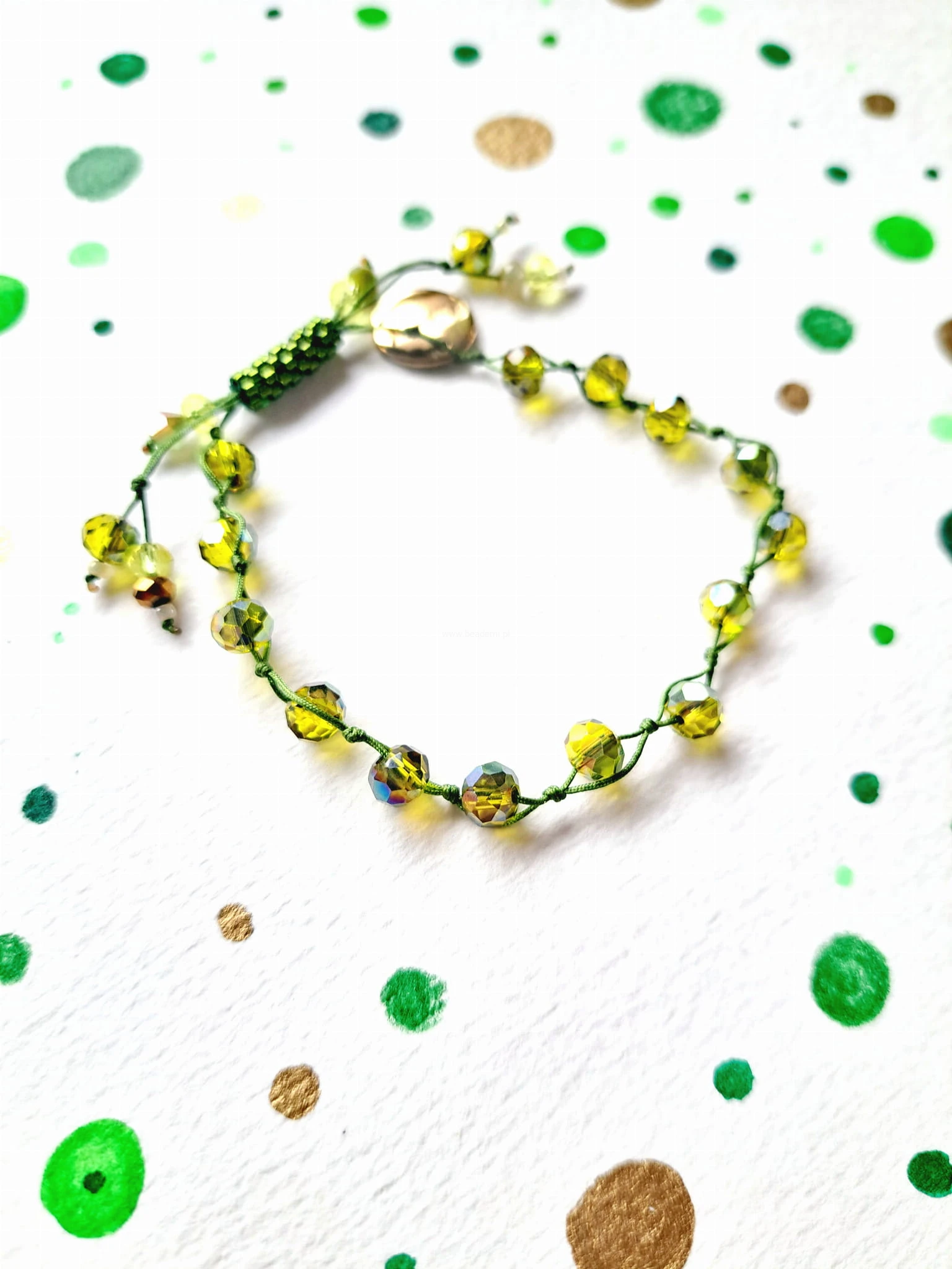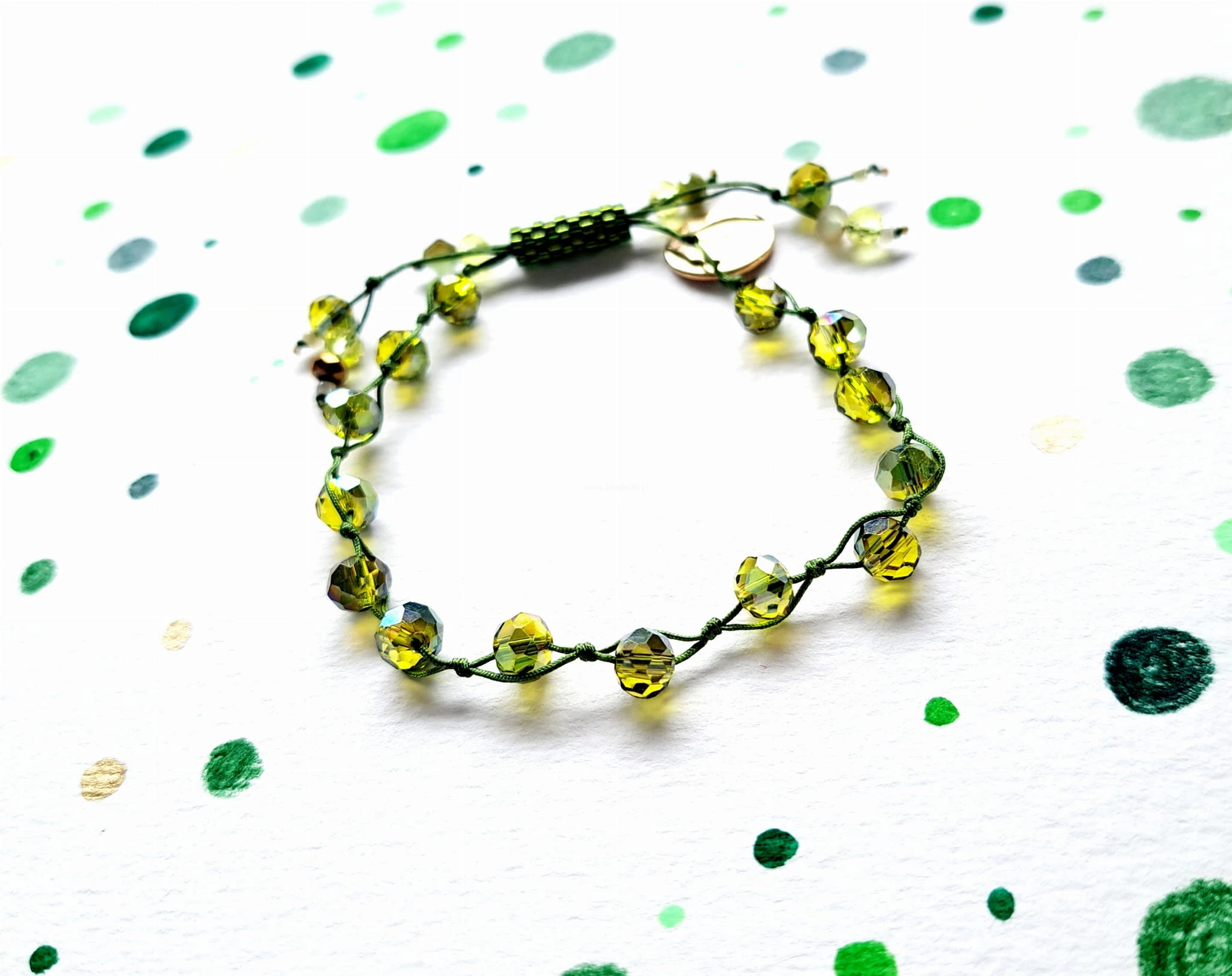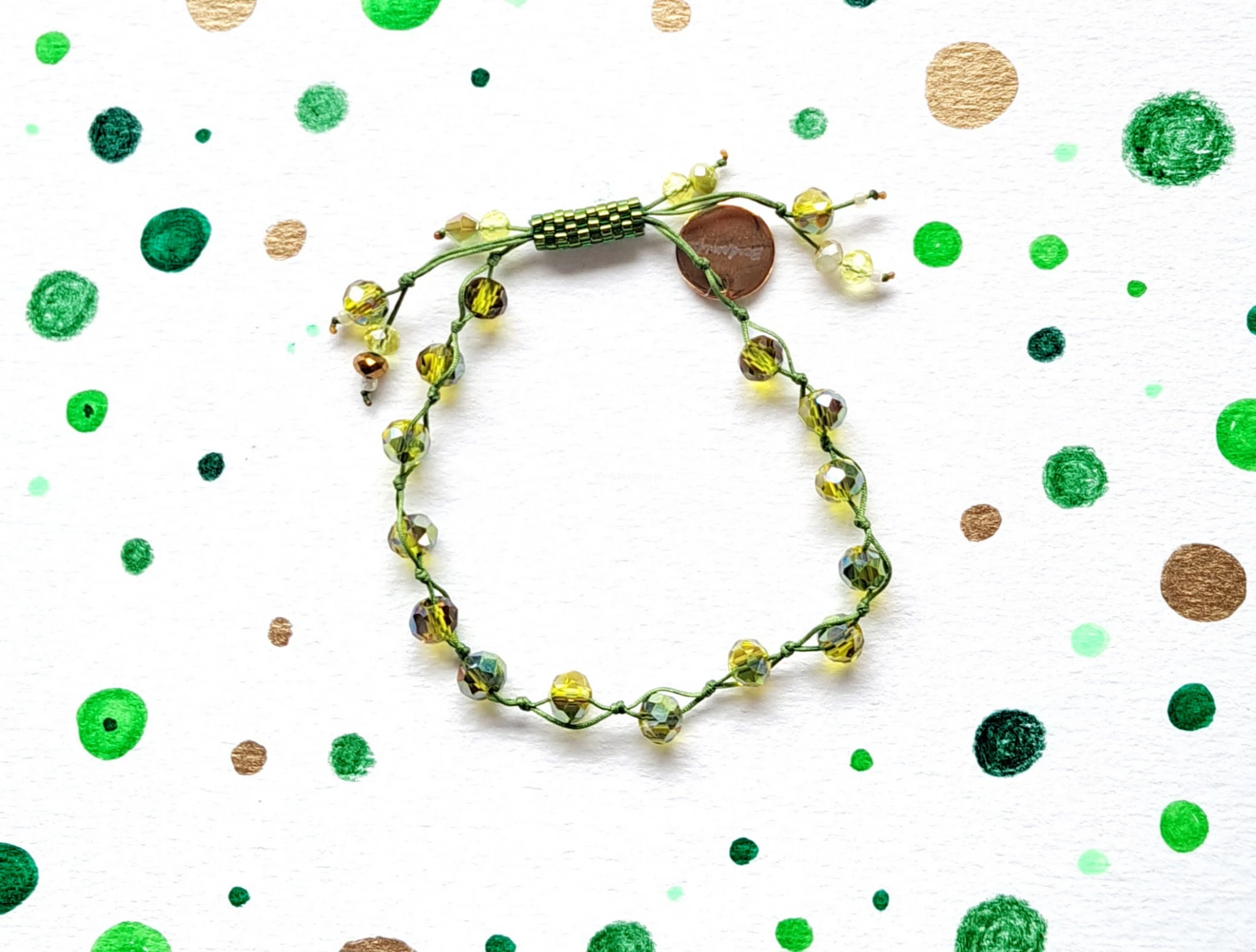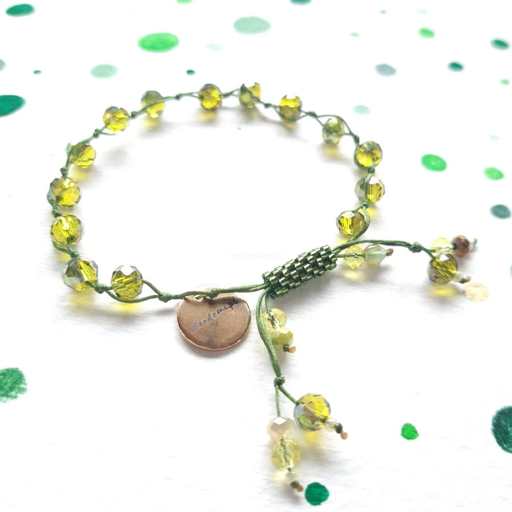 Oprócz szklanych kryształków w różnych odcieniach zieleni  znajdziesz tutaj trwałą tulejkę wykonaną ze szklanych, japońskich koralików Toho. Tulejka trzyma ciasno nitki, więc bransoletka trzyma się mocno na nadgarstku. Jeśli chcesz ściągnąć nitki łap za największe kryształki po bokach tulejki.;-)