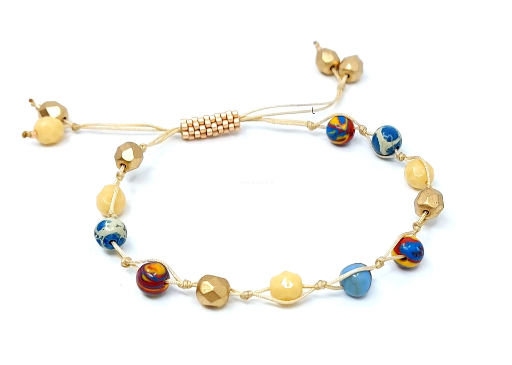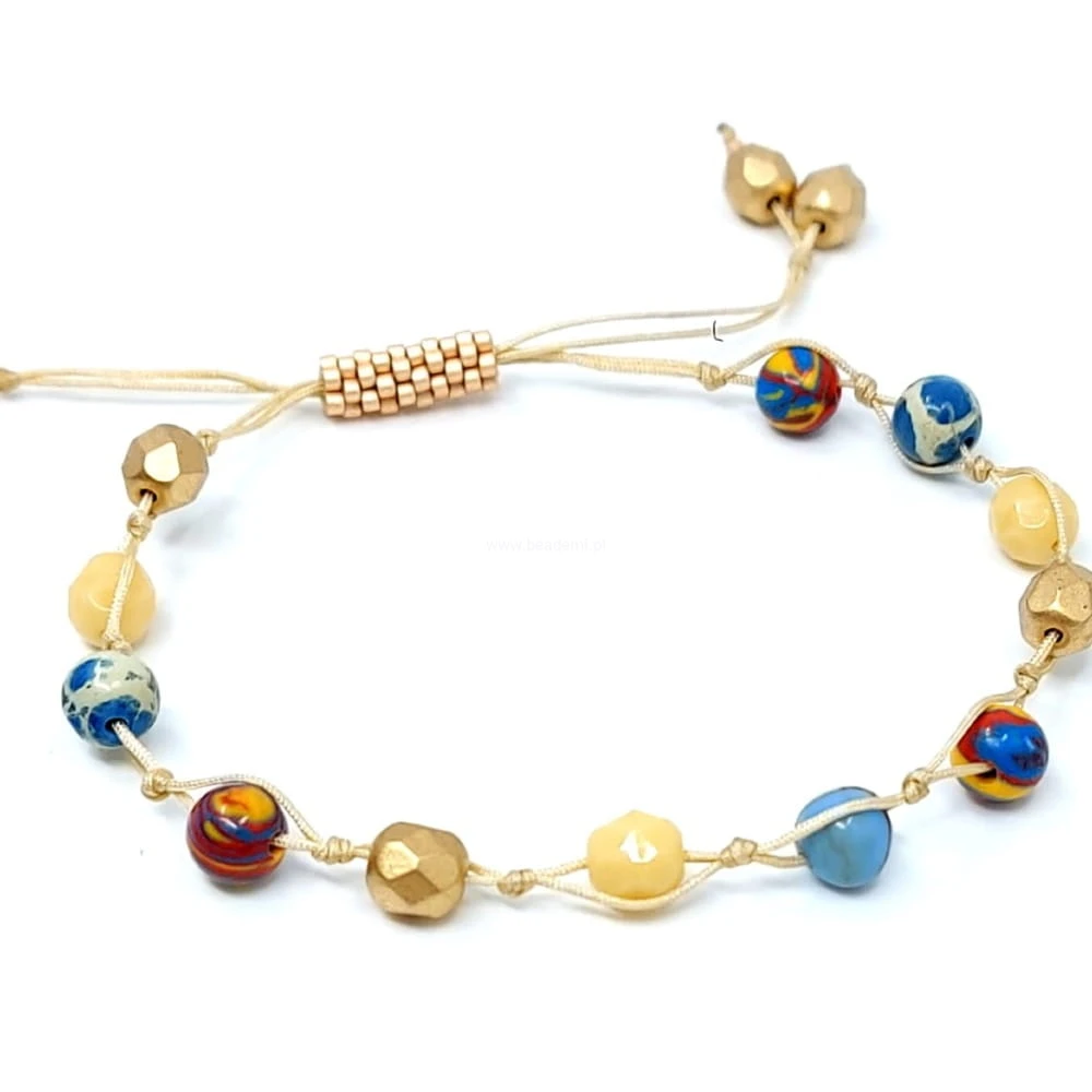 Oprócz szklanych kryształków w różnych odcieniach złota i beżu oraz kulek jaspisu znajdziesz tutaj trwałą tulejkę wykonaną ze szklanych, japońskich koralików Toho. Tulejka trzyma ciasno nitki, więc bransoletka trzyma się mocno na nadgarstku. Jeśli chcesz ściągnąć nitki łap za największe kryształki po bokach tulejki.;-)