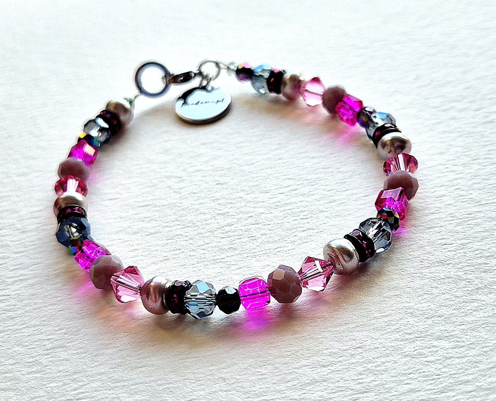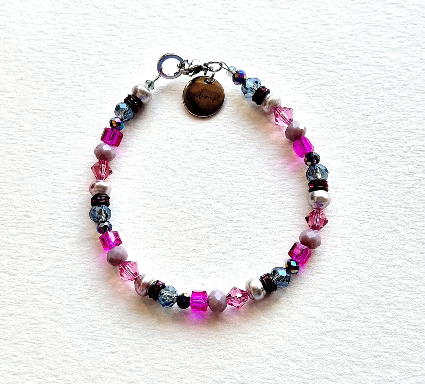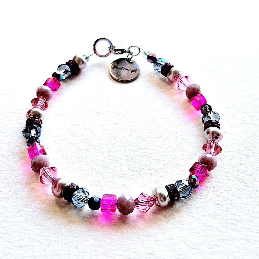 Całości dopełniają i kolorytu dodają szklane kryształki, te w kolorze jasno różowym to kryształki Swarovskiego. Bransoletka ma również znaczek Beademi.pl wykonany ze stali.