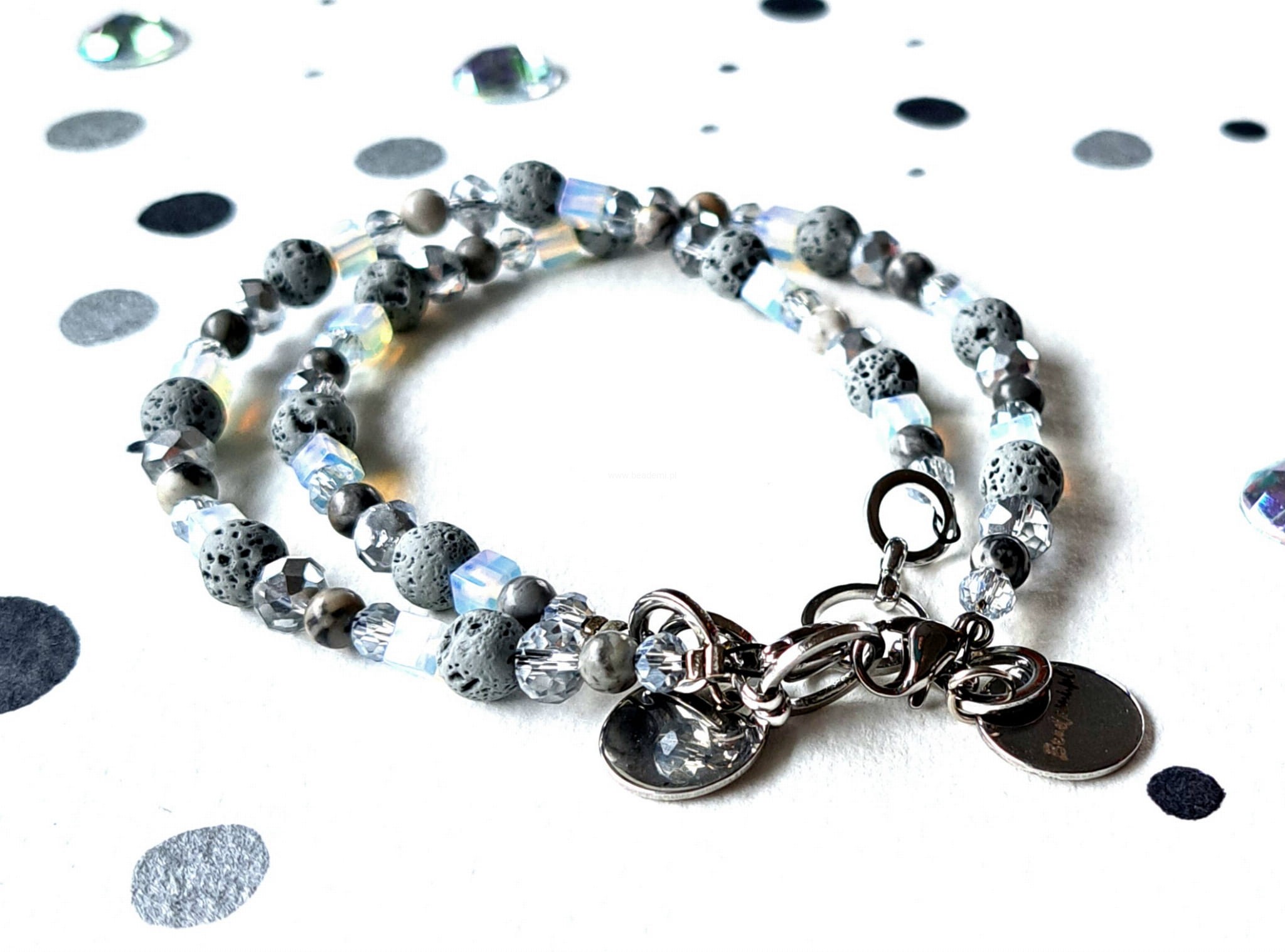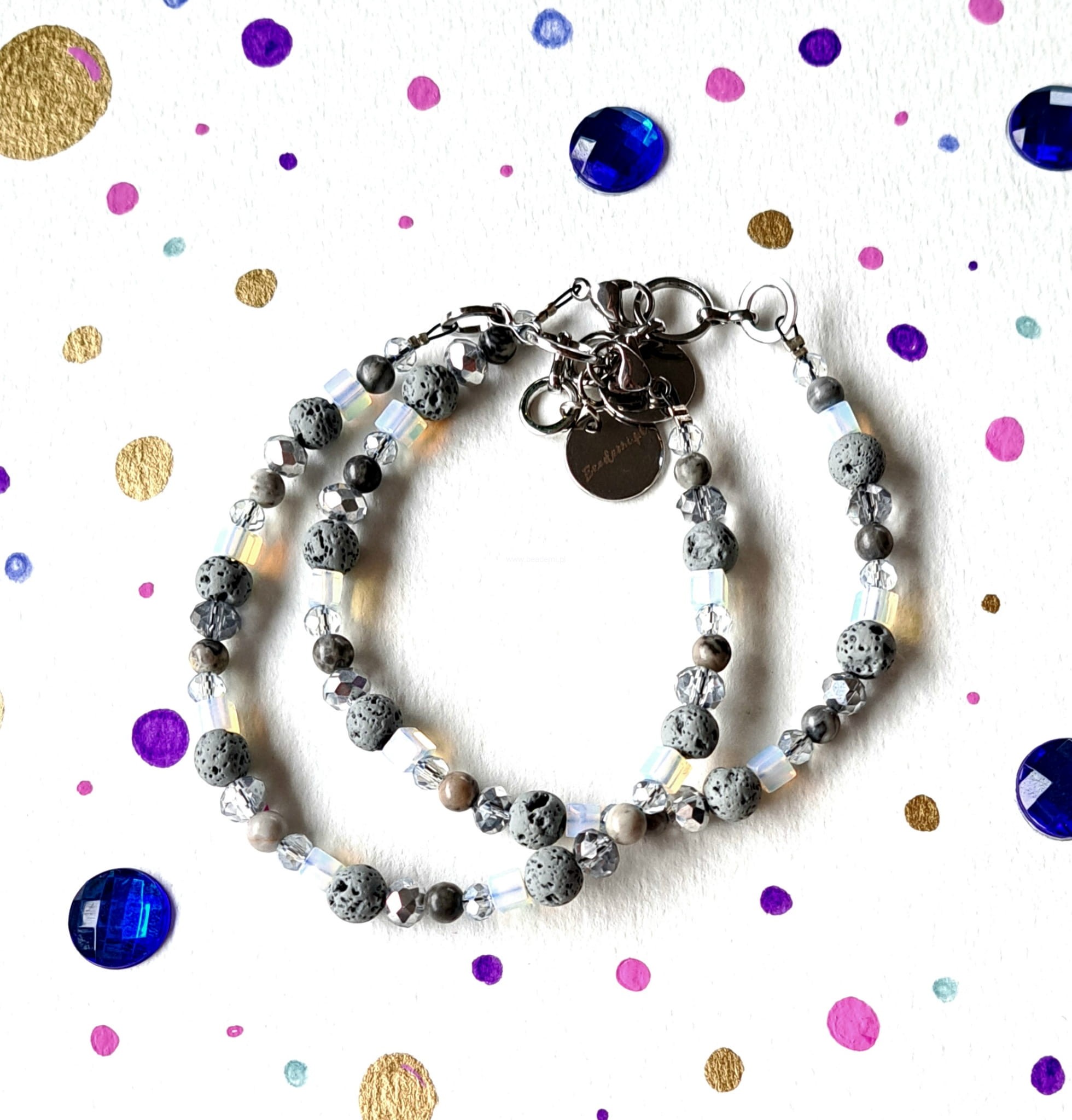 Całości dopełniają i kolorytu dodają szklane kryształki. Bransoletka ma również znaczek Beademi.pl wykonany ze stali.