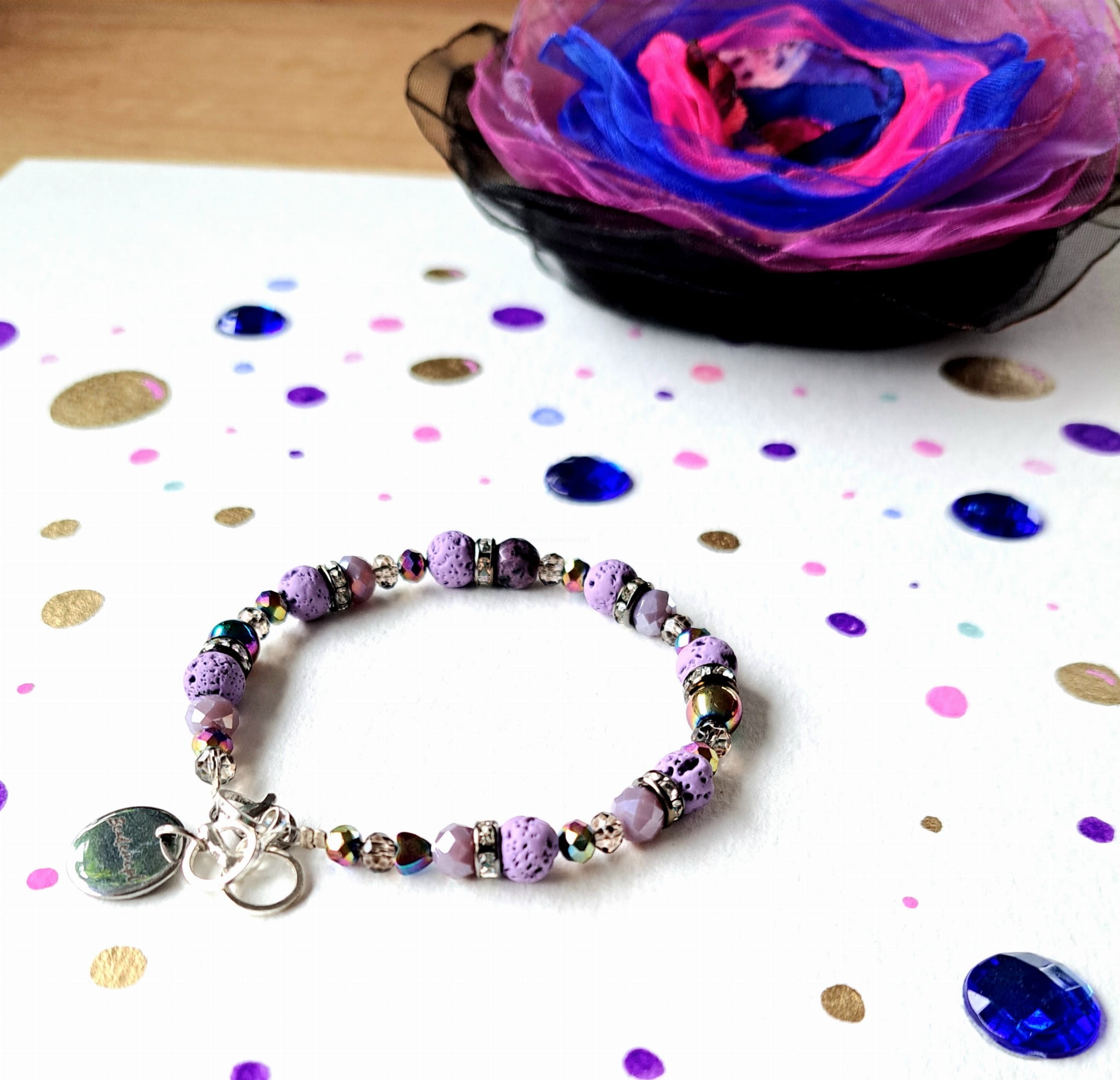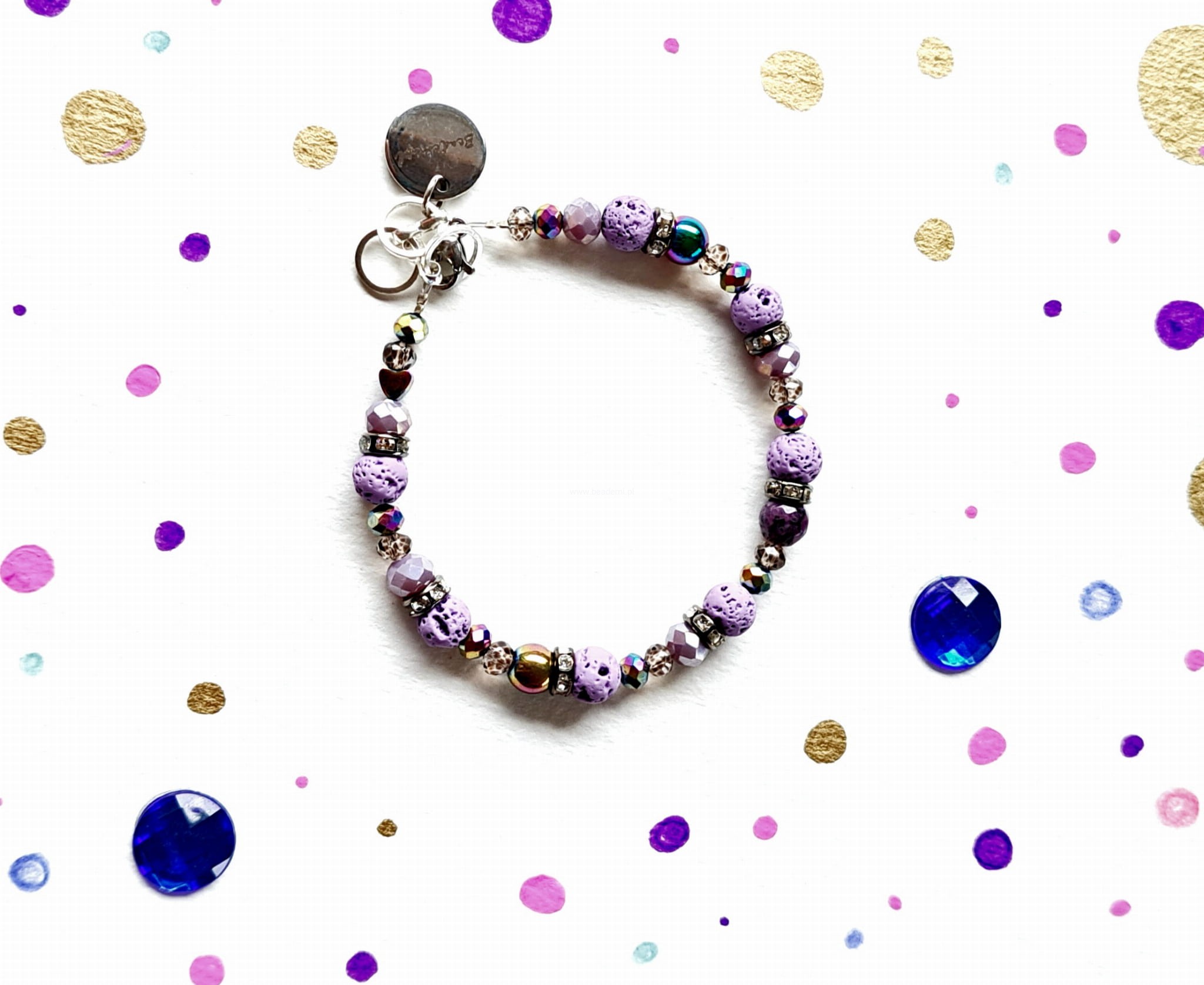 Całości dopełniają i kolorytu dodają szklane kryształki. Bransoletka ma również znaczek Beademi.pl wykonany ze stali.