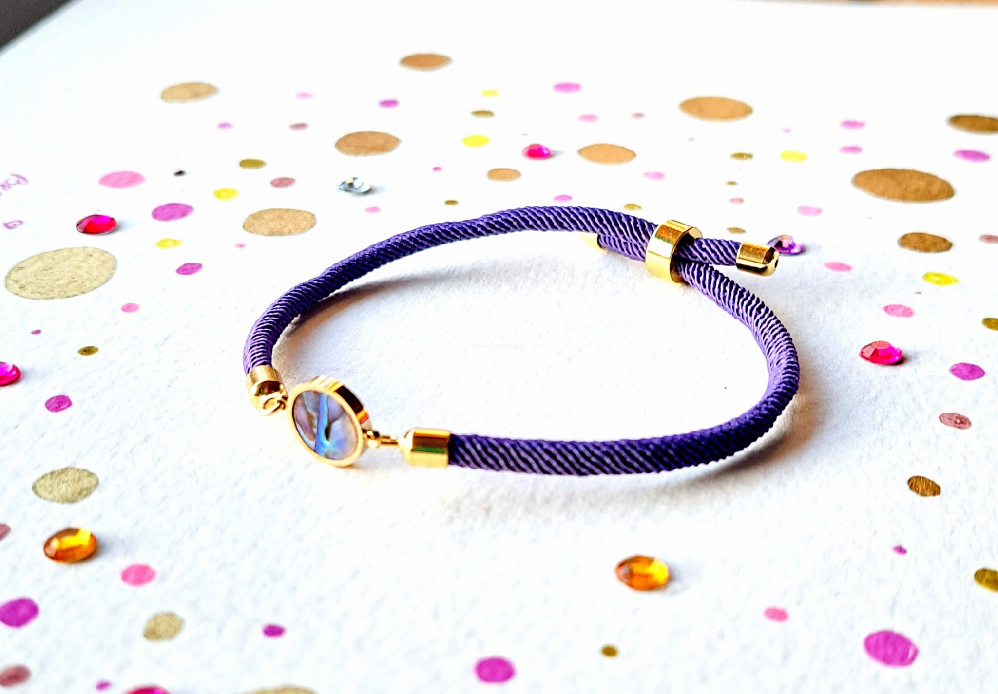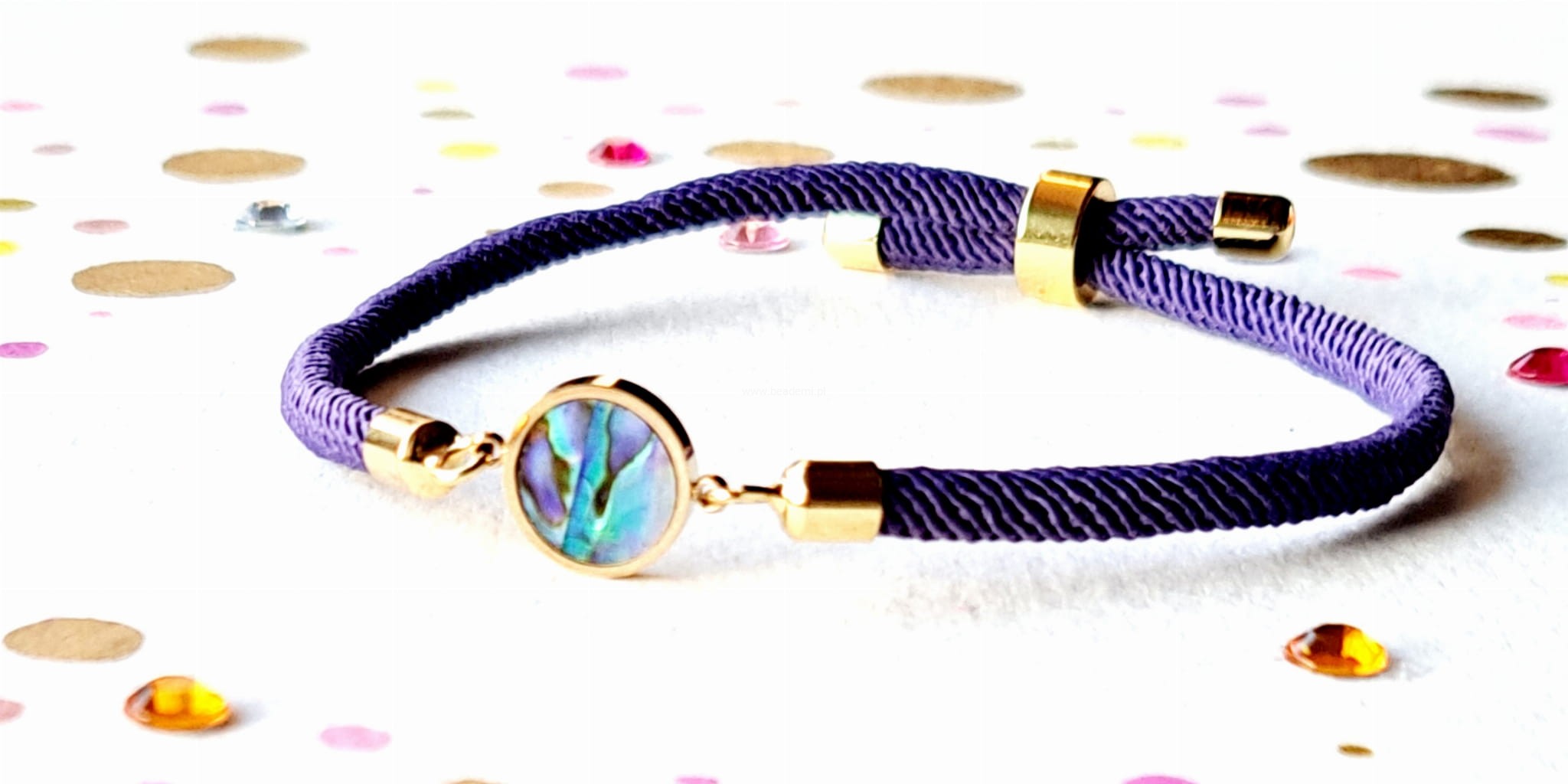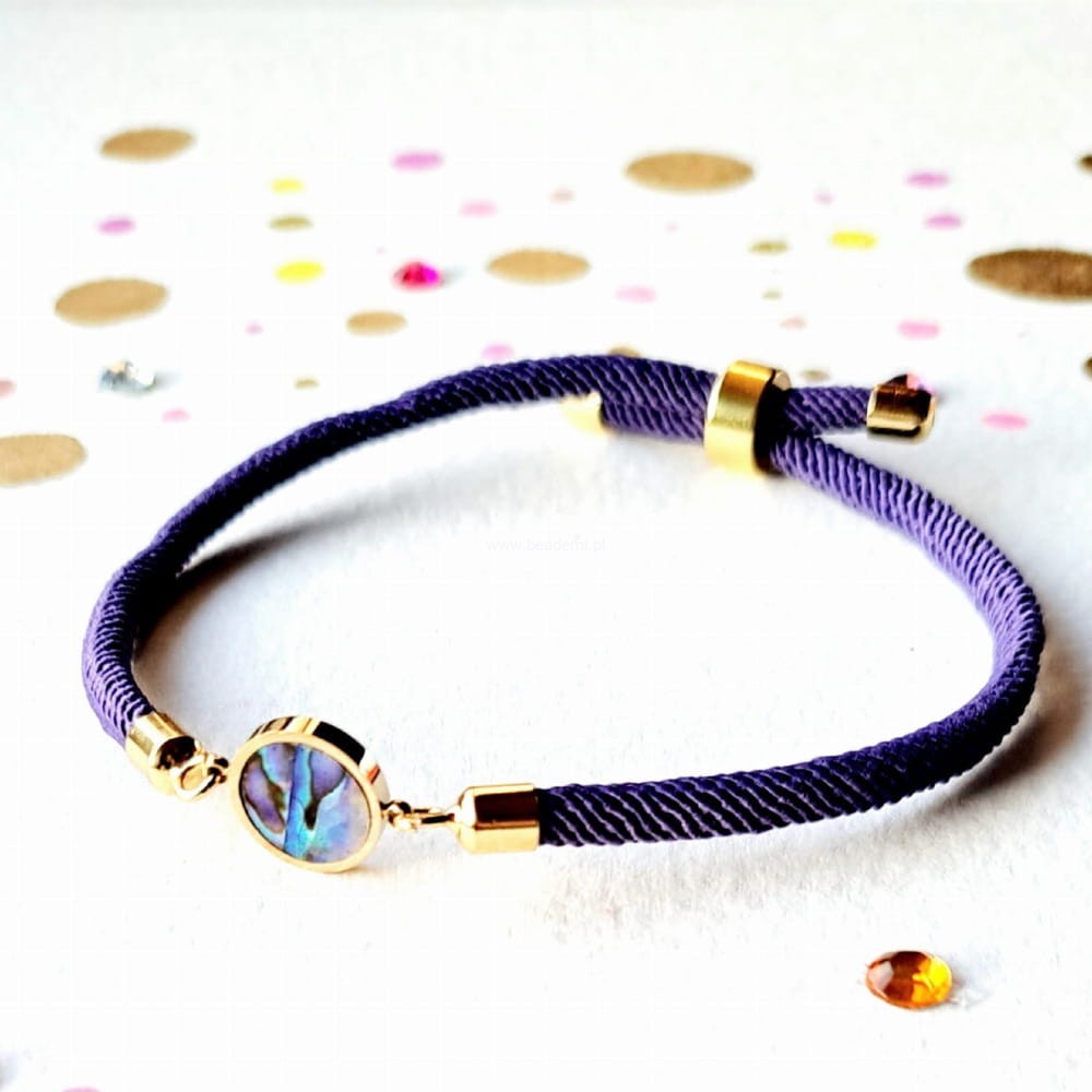 Sznurek jest tutaj w kolorze fioletowym, a główną jej ozdobą jest kółko ze stali wypełnionej perłową, opalizującą muszlą paua. Kółko ma średnicę 1 cm.