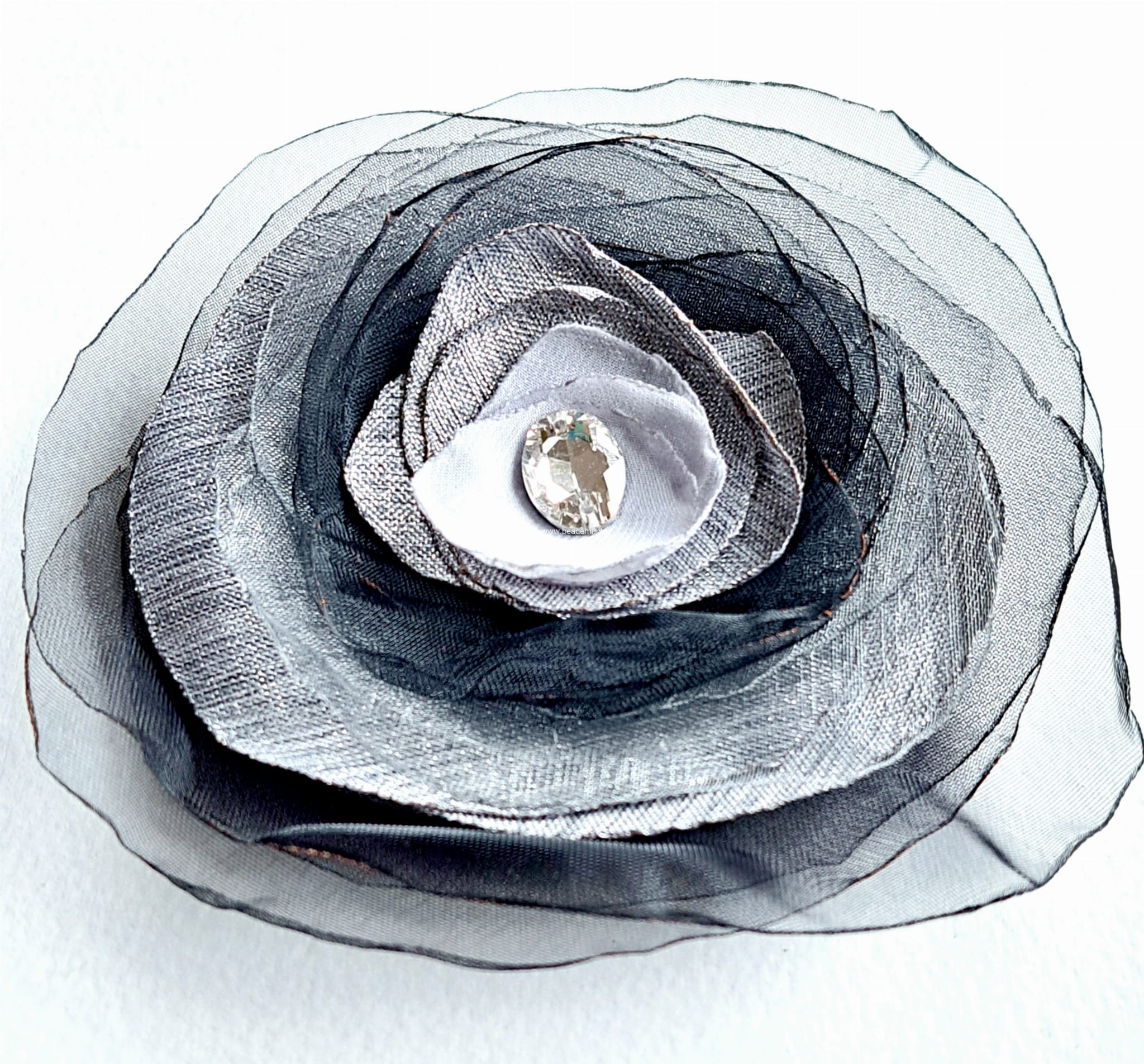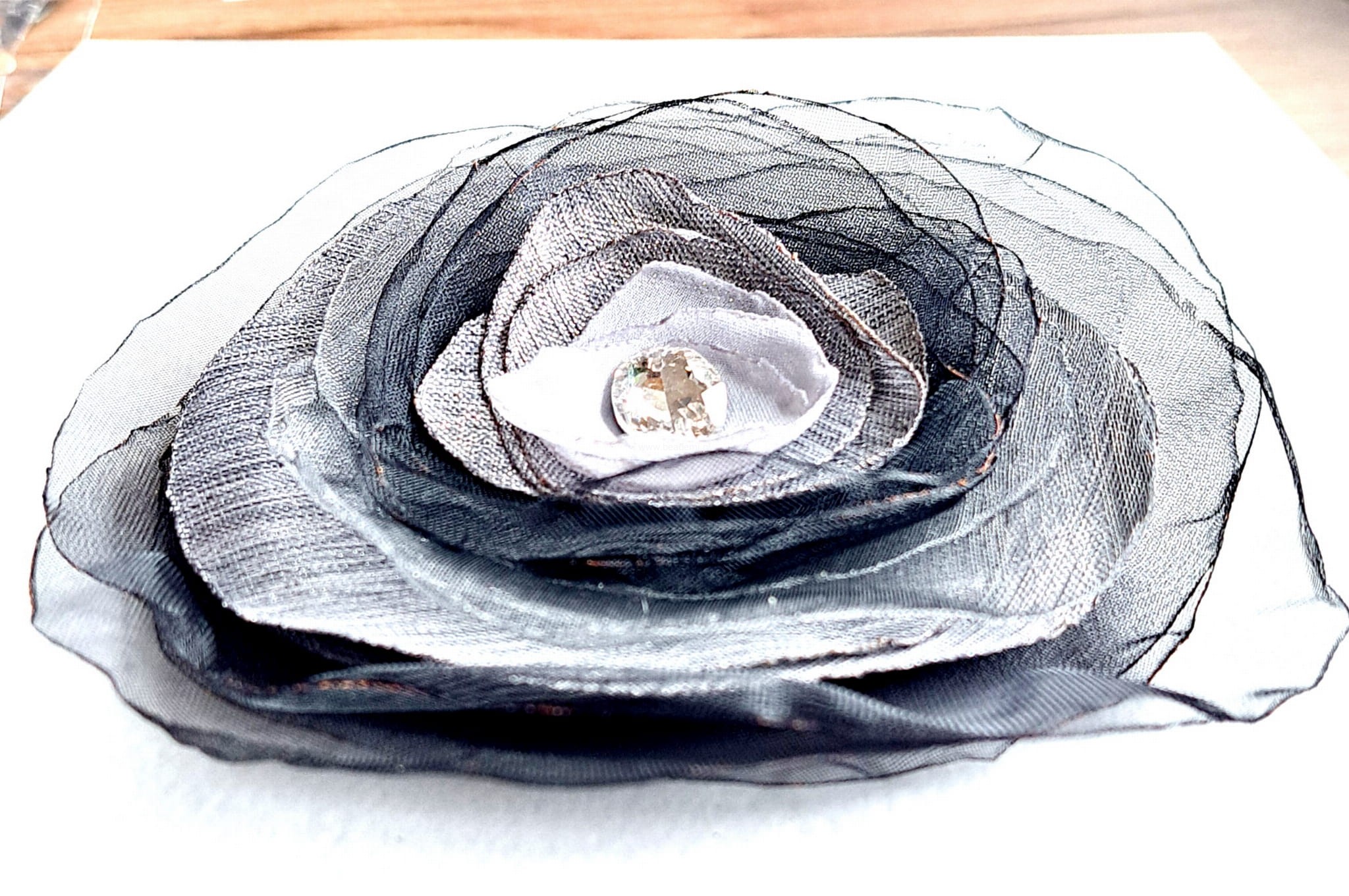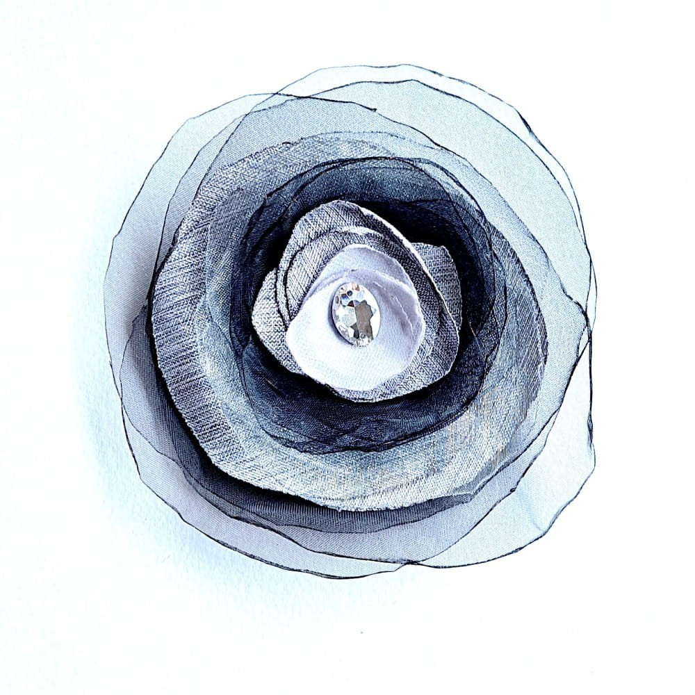 Będzie piękną ozdobą Twojego szala, swetra, żakietu, czapki czy głowy. Stworzyłam ją z przezroczystej organzy oraz szyfonu. Z tyłu broszka ma podwójne zapięcie, może służyć jako broszka albo spinka na głowę, czy też mały kapelusik. Całości dopełnia szklany kryształek.
