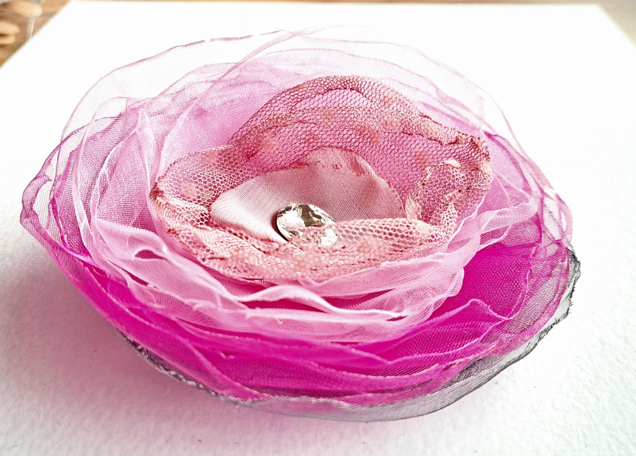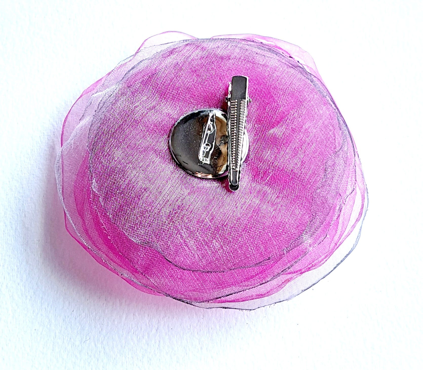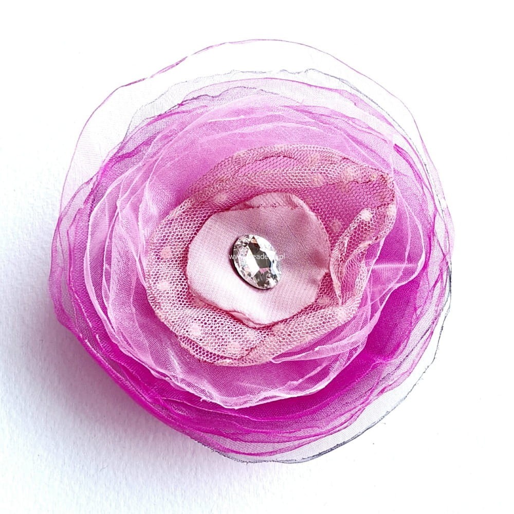 Będzie piękną ozdobą Twojego szala, swetra, żakietu, czapki czy głowy. Stworzyłam ją z przezroczystej organzy oraz szyfonu. Z tyłu broszka ma podwójne zapięcie, może służyć jako broszka albo spinka na głowę, czy też mały kapelusik. Całości dopełnia szklany kryształek.