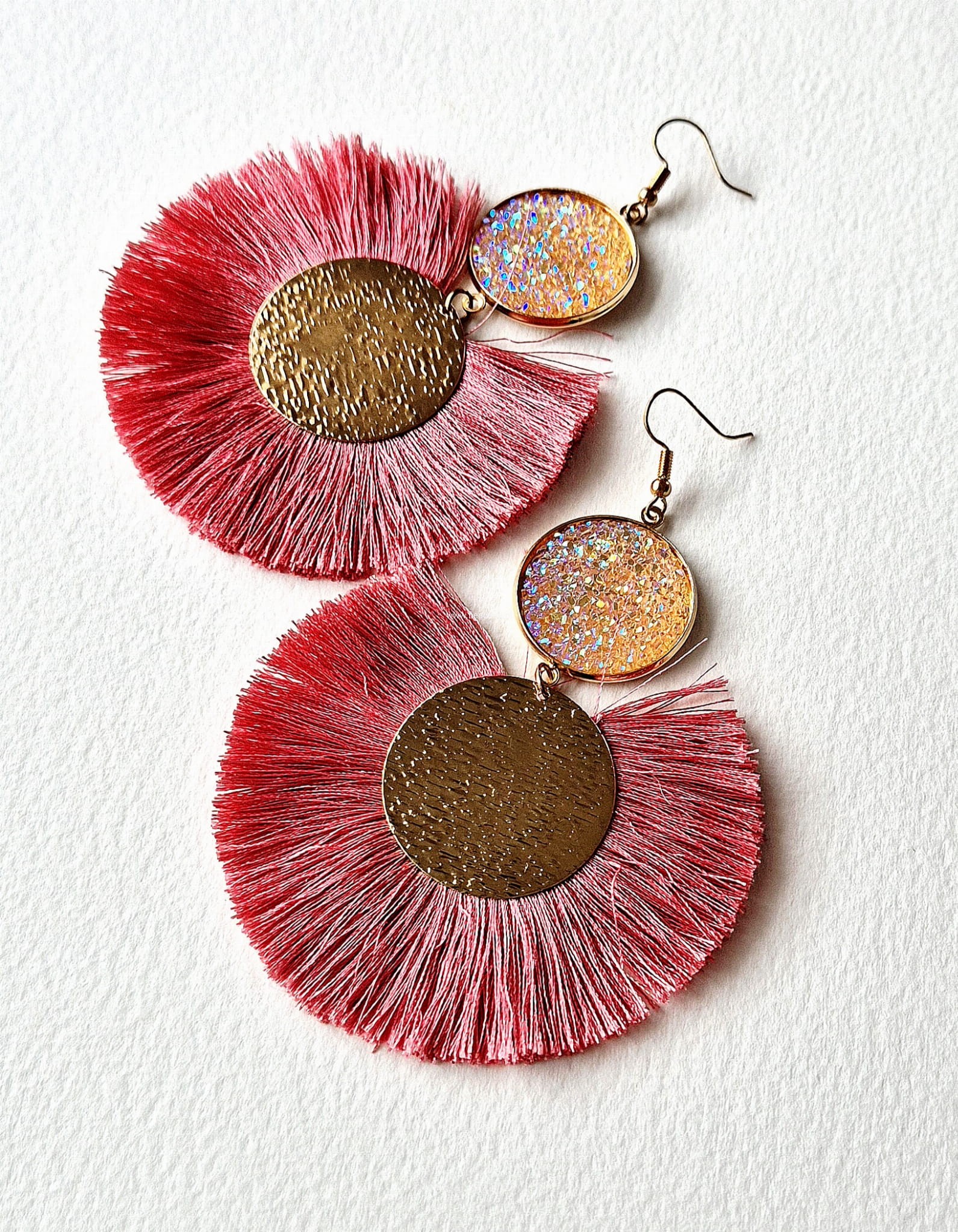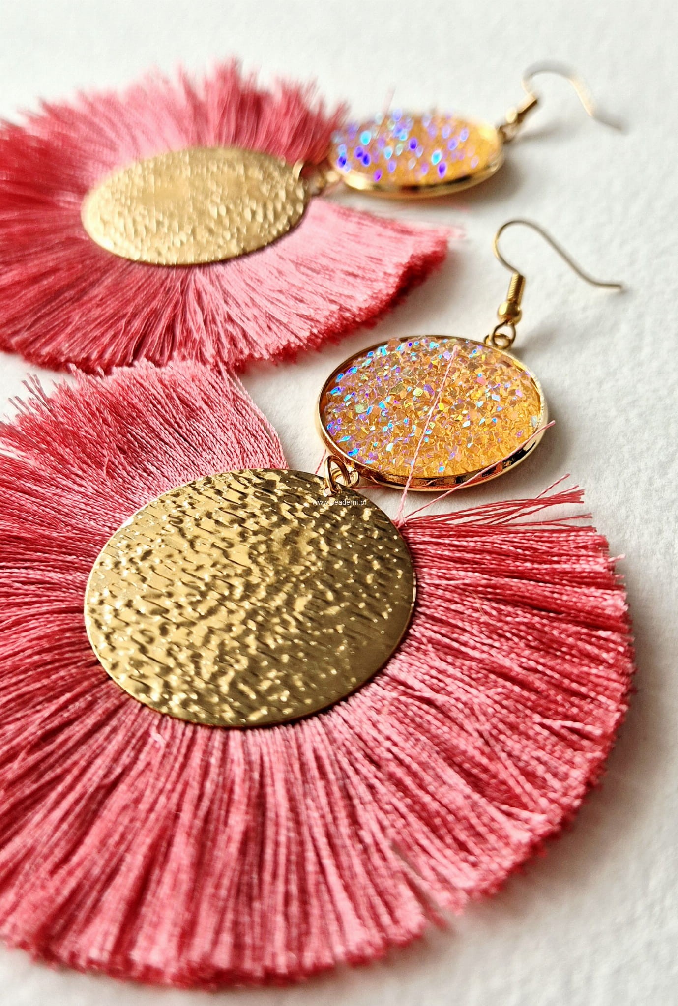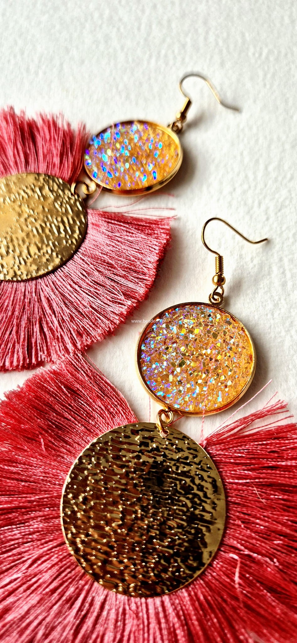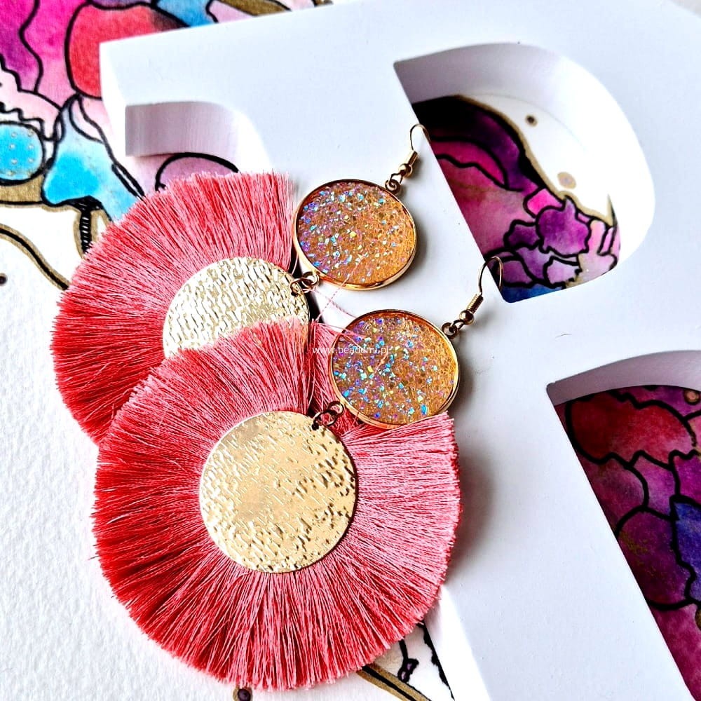 Kolczyki z serii blask mają długość 7,5 cm a ich szerokość to 8 cm. Bogate chwosty wiszą na stalowym biglu koloru złotego. W środku chwosta uwagę przykuwa dekoracyjny element wypełniony połyskującą i mieniącą się jak brokat żywicą.