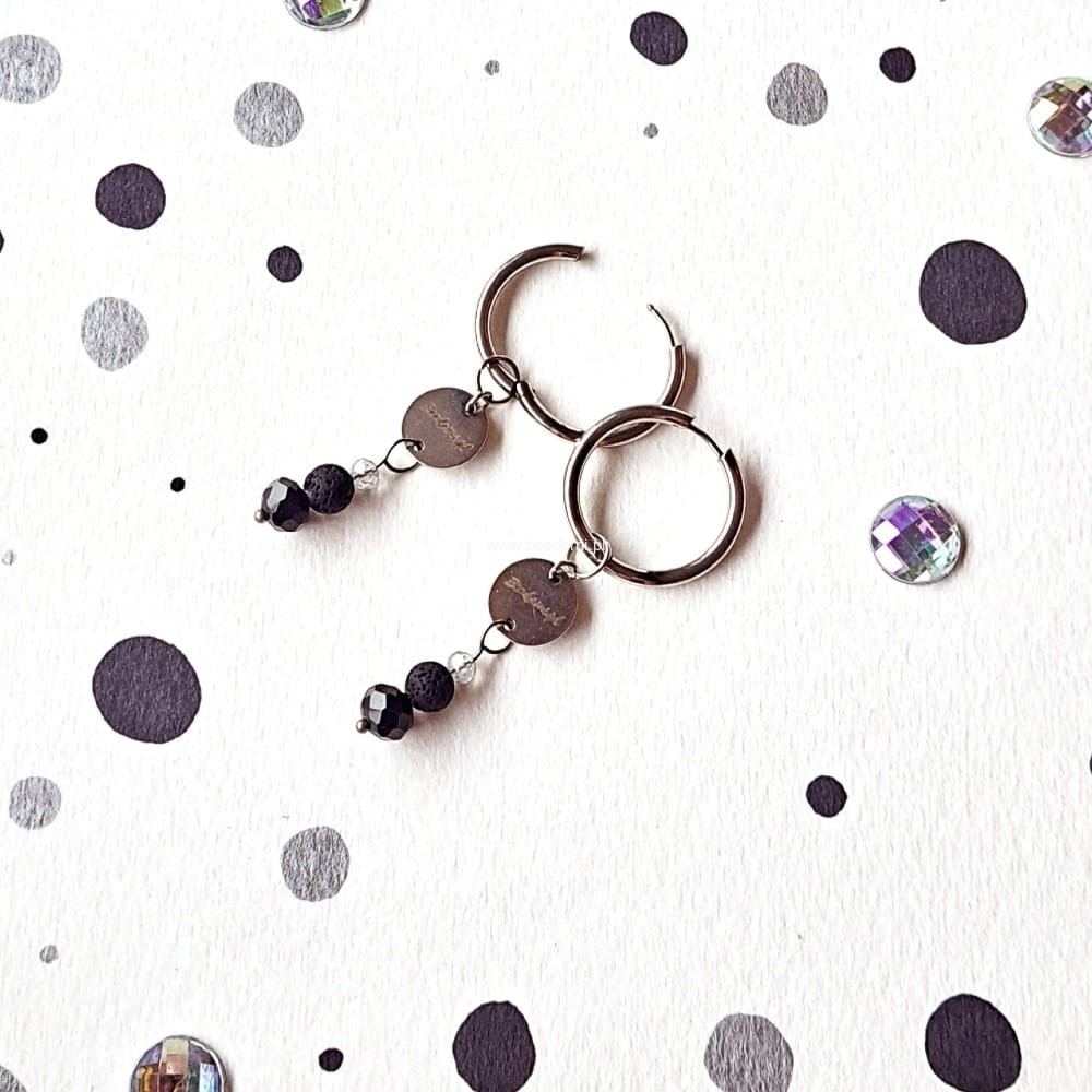 Kolczyki z kryształkami i lawą mają długość 6 cm. Na stalowych kółkach zawiesiłam cudownie lekkie kryształki i kulki lawy.