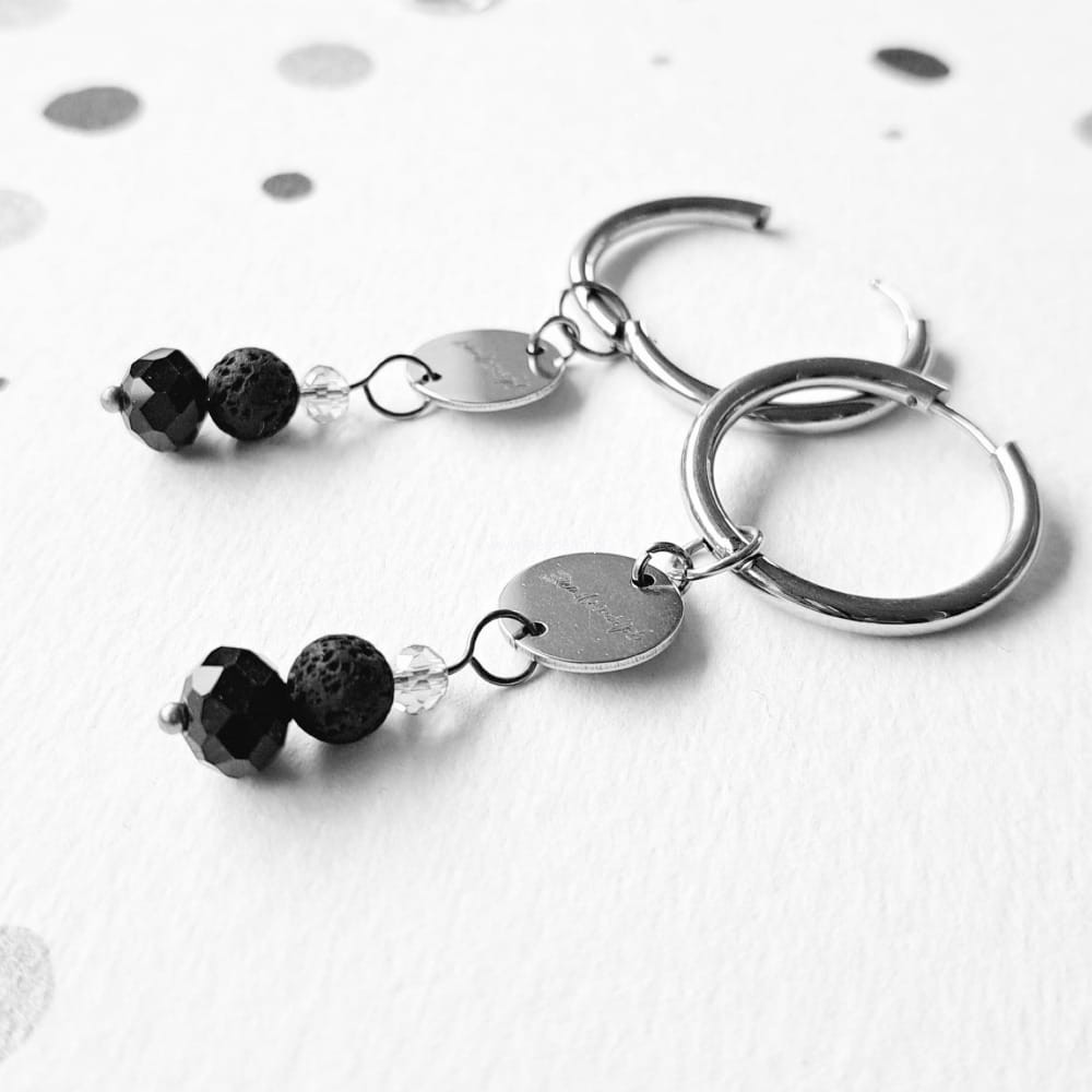 Kolczyki z kryształkami i lawą mają długość 6 cm. Na stalowych kółkach zawiesiłam cudownie lekkie kryształki i kulki lawy.