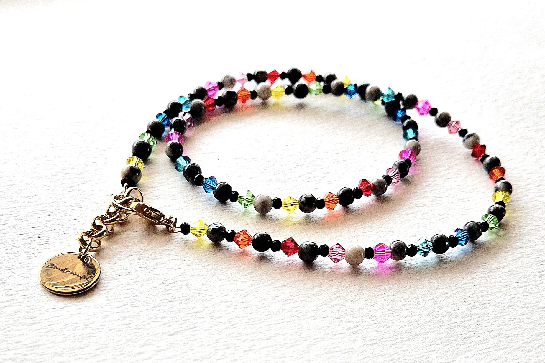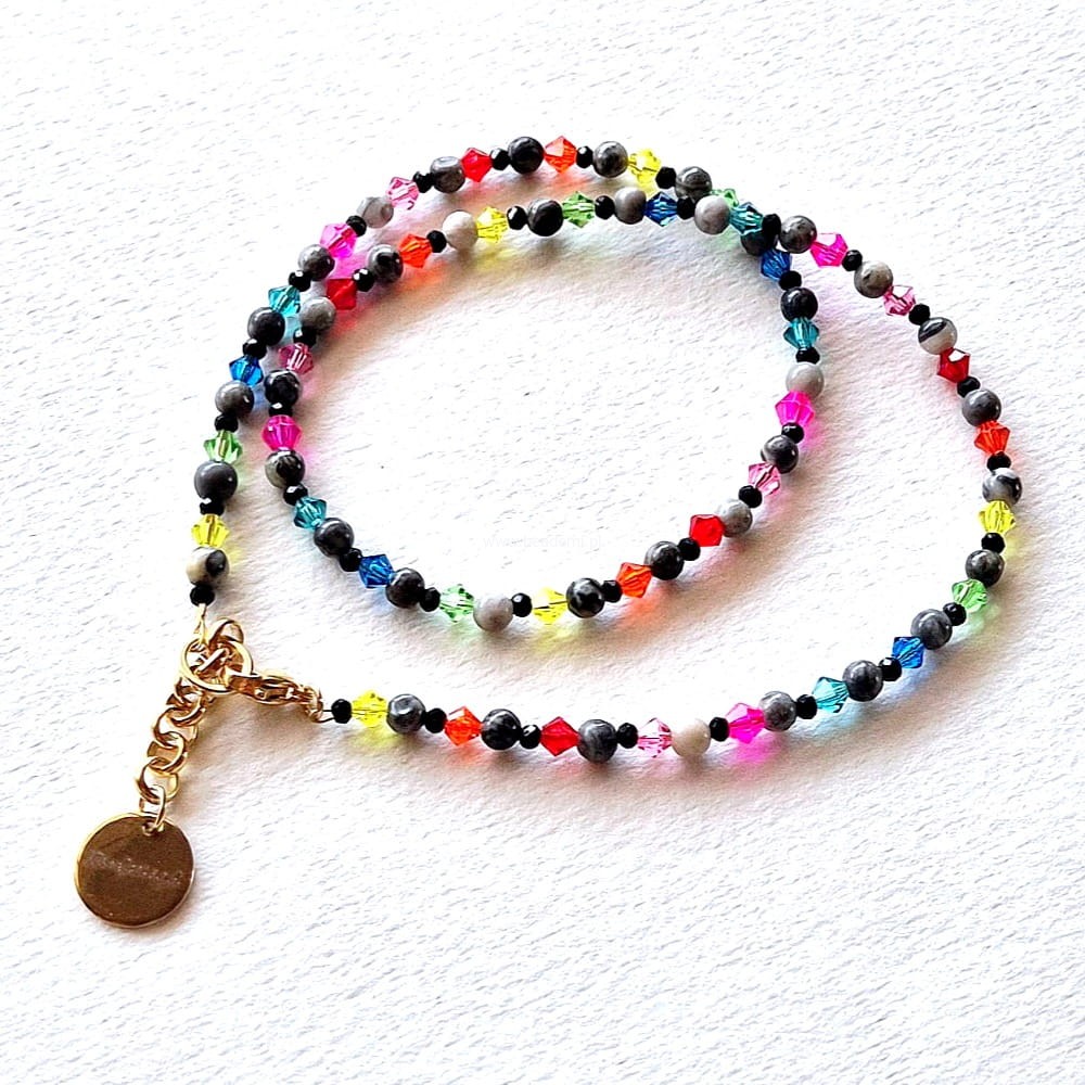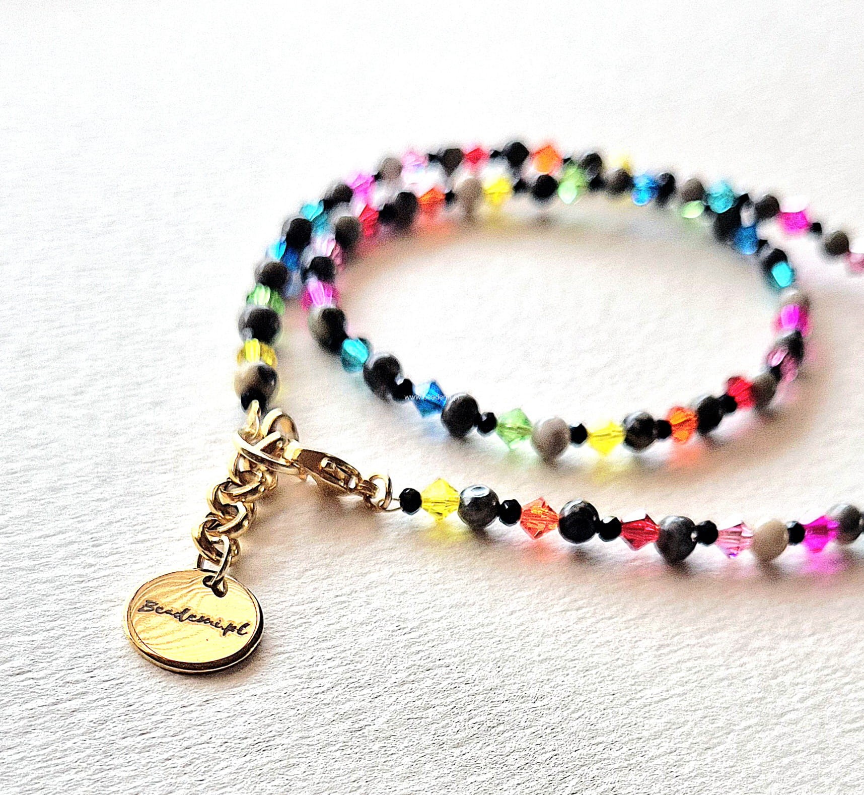 Całości dopełniają i kolorytu dodają szklane kryształki. Naszyjnik ma również znaczek Beademi.pl wykonany ze stali.